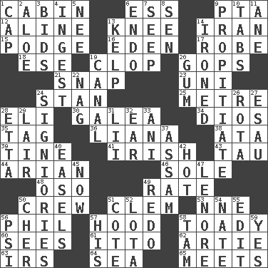 ACROSS 1. Small house or cottage 6. Curvy letter 9. Parent Teacher Assoc. 12. Place in a line 13. Leg joint 14. SW Asia republic 15. Porridge 16. Locale of original sin 17. Loose flowing garment 18. Compass dir. 19. Hoof sound 20. Republicans 21. Fastener 23. Single; one (prefix) 24. Comedian Laurel of Laurel & Hardy 25. Distance measurement (Brit.) 28. Connecticut Ivy Leaguer 30. An organ shaped like a helmet 34. "Vaya con ____" 35. Label 36. Woody, climbing, usually tropical plant 38. _ moment's notice (2 wds.) 39. Prong on a fork 41. From or relating to Ireland 43. The 19th letter of the Greek alphabet 44. Believer in; advocate of (suffix) 46. Not divided or shared with others 48. Bear (Spanish) 49. Pace 50. Ship's personnel 51. Clement's nick name 53. Compass dir. 56. Silvers or Donahue 57. Parka part 58. Sycophant 60. Perceives with the eye 61. "Tell ____ the Marines!" 62. Nick name for Arthur 63. Big collection agency 64. Ocean 65. Confronts DOWN 1. Head covering 2. Medicinal plant 3. Auction offers 4. Swallow 5. Born 6. Inside; within (prefix) 7. Ooze 8. Elected rep. 9. Conciliate 10. Bar bills 11. One (Scot) 13. Seaweed 14. Pressed 19. Lessep's creation 20. Chewing product 22. Tired old horse 24. Seigniories (variant) 26. Round or rotation of duties 27. He sold his birthright 28. Singer James 29. Den 31. Cards in a Roman deck? 32. Hearing organ 33. Cuckoo 37. Indian state 40. Artist's stands 42. Being at a high temperature 45. Immediately 47. Poe poem 49. Make new 50. "Mermaids" star 51. ____ d'Azur (French Riviera) 52. Globular water bottle used in Asia 54. Nathan's nickname 55. Prepare for publication 56. Air pressure measure (abbr.) 57. Part of HMS, perhaps 58. Scottish cap 59. Affirmative reply