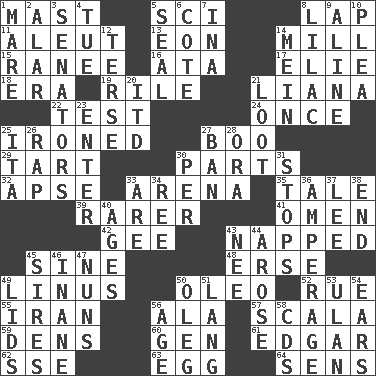 ACROSS 1. Vertical spar for supporting sails 5. _-fi 8. Pet locale 11. Native American of Southwest Alaska 13. Period of immesurable duration 14. Place where flour is made 15. The wife of a rajah (variant) 16. "One Day ___ Time" 17. Writer Wiesel 18. Period 19. Cause heat under the collar 21. Woody, climbing, usually tropical plant 22. Trial 24. Single time 25. Pressed 27. Surprise greeting 29. Small pie 30. Components 32. Domed church section 33. Sports stadium 35. Story 39. More uncommon 41. Sign of something about to happen 42. Unit of force equal to gravity 43. Slept 45. Trig term 48. Celtic language 49. "_ and Lucy" (Charlie Brown theme song) 50. Butter sub 52. Sorrow 55. SW Asia republic 56. Insect wing 57. Any of the three canals of the cochlea 59. Lairs 60. Commissioned mil. rank 61. _ Allan Poe 62. Compass dir. 63. Ovum 64. Elected reps. DOWN 1. Female horse 2. Having or resembling wings 3. Elected representatives 4. Third day of the wk. 5. Lick closed 6. ____ d'Azur (French Riviera) 7. _ tizzy (2 wds.) 8. Pale purple color 9. Place in a line 10. Entreaty 12. Laconic 14. Count _ (2 wds.) 20. It would 21. Spoils 23. Keyboard key 25. Call ___ day 26. Reproach for some lapse or misdeed 27. Prohibit 28. Mouth or opening 30. For each 31. Discontinues 33. "We ___ not amused" (Victoria) 34. To sift 36. Electrical Measurement 37. Area sheltered from the wind 38. Conclude 40. Eras 43. Born 44. Came up 45. Begets 46. Lacking in sense or substance 47. Religious women 49. Flaplike coverings 50. Cassini of fashion 51. Long (Scottish) 53. Uhlan (variant) 54. Hearing organs 56. Ripen 58. Music discs
