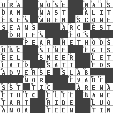 ACROSS 1. Mouth or opening 4. Sense of smell 8. Floor coverings 12. One of the 12 tribes of Israel 13. Political cartoonist Thomas 14. Came down and settled, as after flight 15. Makes supply last 17. Songbird 18. Biscuitlike quick bread 19. Seines 21. Curve 23. Eastern Standard Time (abbr.) 24. Frees from moisture 26. Greek goddess of the dawn 28. Lightbulb-shaped fruit 30. Modes 34. English channel? 37. Trig term 39. Armor plate that protects the chest 40. Snakelike fish 41. Scornful expression 43. Allow 44. Put down 46. Suttee (variant) 47. Begley and Asner 48. Contrary to your interests or welfare 51. Thick slice 54. Not either 55. Elude 58. Fast jet (abbr.) 61. Nervous spasm 63. Sports stadium 65. Principle of right and wrong 67. Writer Wiesel 71. Object of repulsion 72. Small pie 73. Travel on an animal 74. Nilotic language 75. Small Philippine buffalo 76. Adolescent 77. Shallow baking pan DOWN 1. Lyric poems 2. Moved through 3. Approach 4. Compass dir. 5. Boat paddle 6. Compass dir. 7. Inactive volcano in Sicily 8. Apple computer (short form) 9. Medicinal plant 10. Metal containers 11. Proofreading order 16. Sever or remove by pinching or nipping 18. Highlander 20. Perceive with the eye 22. To separate or throw off 25. Backtalk 27. A female animal or person 29. Wash lightly 30. Confronts 31. Stare at amorously 32. Passed on 33. Fast planes 34. Actor Lugosi 35. Necklace unit 36. 154 in Roman numerals 38. Teachers' org. 42. Cause heat under the collar 45. Lair 49. College mil. group 50. _ Lanka 52. Actress Gardner 53. Sharp remark 56. Started a card game 57. World-weariness 58. Stalk of a moss capsule 59. Comedian Laurel of Laurel & Hardy 60. Through, poetically 62. Foregone conclusion 64. A really long time 66. Call ___ day 68. Untruth 69. Binary compound 70. Car or cant ending