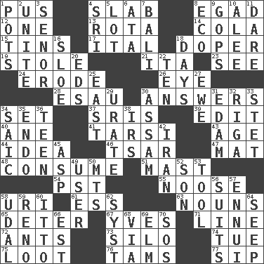 ACROSS 1. Product of festering 4. Thick slice 8. Mild oath 12. Single 13. Round or rotation of duties 14. Root beer relative 15. Metal containers 17. Slanted text style (abbr.) 18. Drug addict 19. Fur scarf 21. Call ___ day 23. Perceive with the eye 24. Eat (away) 26. Sight organ 28. He sold his birthright 30. Responds (to) 34. Put into a specified state 37. Indian titles of respect 39. Prepare for publication 40. A saturated hydrocarbon 41. Tarsus (plural) 43. Personal question 44. It may be bright or harebrained 46. Russian ruler of old 47. Floor protector 48. Ingest 51. Vertical spar for supporting sails 54. Pacific Standard Time (abbr.) 55. Trap for birds or small mammals 58. RI univ. 61. Double-curved letter 63. Parts of speech 65. Prevent from occurring 67. Jacques Cousteau's middle name 71. Actor's bit 72. Pismires 73. Grain storage tower 74. Third day of the wk. 75. Spoils 76. Scottish caps 77. Small drink DOWN 1. Plant holders 2. Join together 3. Sir (Sp.) 4. Indian title of respect (Mr.) 5. Car dealer's back yard 6. "One Day ___ Time" 7. Indonesian resort city 8. Environmental prefix 9. Republicans 10. Toward shelter 11. Have the gumption 16. _ gin 18. 24-hour periods 20. Begley and Asner 22. Nine, plus one 25. Compass direction 27. She-sheep 29. A salt of uric acid 30. Indian state 31. Dutch treat 32. Capital of Latvia 33. Proofreading order 34. Ketch in the Levant 35. Inside; within (prefix) 36. Adolescent 38. Big collection agency 42. SW Asia republic 45. Viper 49. One who uses or employs something 50. Mountains (abbr.) 52. Male child 53. Instrument 56. Sets or collections 57. World-weariness 58. Allodial 59. Former U.S. Attorney General Janet 60. "Tell ____ the Marines!" 62. System (abbr.) 64. Ooze 66. Eastern Standard Time (abbr.) 68. By way of 69. Shade tree 70. Distress signal