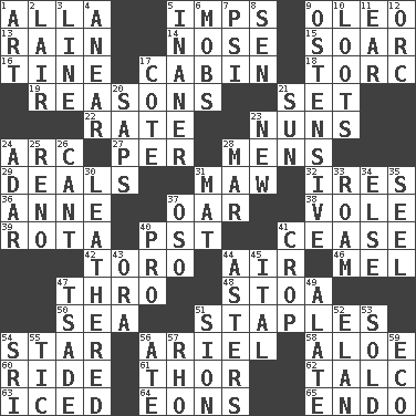 ACROSS 1. Silent film actress Nazimova 5. Naughty children 9. Butter sub 13. Water falling in drops from the sky 14. Characteristic smell of wine 15. Fly high 16. Prong on a fork 17. Small house or cottage 18. Torque (variant) 19. Thinks logically 21. Arrange properly for use 22. Assign a rank or rating to 23. Religious women 24. Curve 27. For each 28. Not women's 29. Allots cards 31. Informal term for the mouth 32. Angers 36. Singer Murray 37. Rowing implement 38. Short-tailed, large-bodied rat 39. Round or rotation of duties 40. Pacific Standard Time (abbr.) 41. Stop 42. "Corrida" creature 44. Wind 46. Cartoonist voice _ Blanc 47. Through, poetically 48. Portico 50. Ocean 51. Paper fasteners 54. Play the lead 56. Satellite of Uranus 58. _ vera 60. Travel on an animal 61. Son of Odin 62. Baby powder 63. On the rocks 64. Immeasurably long periods of time 65. Inside; within (prefix) DOWN 1. Tate display 2. Den 3. Actor's bit 4. Approach 5. More lacking in sense or substance 6. Crowds into 7. Air pressure measure (abbr.) 8. Elected rep. 9. Clearly or manifestly demonstrative 10. Plunders 11. Hearing organ 12. The grampus (Milton) 17. ____ d'Azur (French Riviera) 20. Plant excrements 21. Player for Phoenix 23. ___ Haven, CT 24. The sixth month of the Jewish calendar 25. Former U.S. Attorney General Janet 26. Patter 28. Third mo. 30. Resembling or made to resemble leather 31. Floor covering 33. Wander 34. Otherwise 35. Stitch closed the eyes of (a falcon) 37. Bear (Spanish) 40. Adept person 41. Riding implement 43. Mouth or opening 44. Michaelmas daisies 45. Slanted text style (abbr.) 47. Sadhe (variant) 49. Having winglike extensions 51. The Jewish people; Israel 52. Style 53. Exchanged or delivered for money 54. _ Lanka 55. Nervous spasm 56. Had dinner 57. 17th letter of the Greek alphabet 59. Environmental prefix