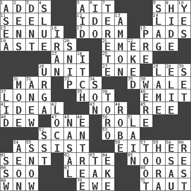 ACROSS 1. Does sums 5. Small island 8. Like a shrinking violet 11. Stitch closed the eyes of (a falcon) 12. The content of cognition 14. Whopper 15. World-weariness 17. Dormintory (informal) 18. Groovy apts. 19. Michaelmas daisies 21. Develop 23. Black tropical American cuckoo 25. Casino tip 26. A single undivided whole 27. Compass dir. 28. French article 31. Third mo. 33. Personal Computers (abbr.) 35. A sleeping potion; an opiate (poet.) 37. Yearn 38. Being at a high temperature 40. Give off 41. Standard of perfection 43. Not either 45. To separate or throw off 46. Morning condensation 47. Single 50. Hero or heavy, e.g. 52. Examine hastily 53. Chief or king in Benin or Nigeria 54. Aid 56. One or the other of two 61. Emitted 62. Johnson of "Laugh-In" 65. Trap for birds or small mammals 66. "Barney Miller" actor Jack 67. Path through which fluid escapes 68. Mouths or openings 69. Compass dir. 70. She-sheep 71. Tense DOWN 1. Toward the sea 2. Lairs 3. Gouge 4. Turn sharply 5. Help 6. Wedding promise 7. Cigar-shaped 8. Volcanic refuse 9. Flintstone garb 10. It is so 13. ID or VA city 16. SW Asia republic 18. Before (prefix) 20. Clip 22. Made supply last 24. Hankering 26. Capital and largest city of Mongolia 28. Unable to walk 29. Writer Wiesel 30. Arrange properly for use 31. Method 32. Afresh 34. Manchild 36. Past tense of be (plural) 37. Flaplike covering 39. "Corrida" creature 42. Venues 44. Loose flowing garment 48. Rhinal 49. Main course 51. (Had) reclined 52. Fast jet (abbr.) 54. Period of immesurable duration 55. Overwhelm 57. A blast of a horn 58. Israeli folk dance 59. Son of Isaac 60. State of inaction 61. Compass dir. 63. The 23rd letter of the Hebrew alphabet 64. Supplement with great effort