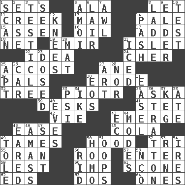 ACROSS 1. Puts into a specified state 5. Chicken ___ king 8. Allow 11. Small stream 13. Opening into something insatiable 14. Diluted with white 15. NE Netherlands city 16. Lubricate 17. Does sums 18. Fish or hair follower 19. Arab leader 21. Small island 22. The main thing one is thinking about 24. "Mermaids" star 25. Buttonhole 27. One (Scot) 29. Friends 30. Eat (away) 32. Woody plant 33. Peter (Polish) 35. "____ silly question..." 39. Writing tables 41. Proofreading order 42. Compete 43. Develop 45. Relaxation 48. Root beer relative 49. Softens 50. Parka part 52. Three (prefix) 55. NW Algerian seaport 56. Friend of Pooh 57. Keyboard key 59. For fear that 60. Mischievous child 61. Biscuitlike quick bread 62. Begley and Asner 63. Two (Sp.) 64. Singles DOWN 1. Examine minutely or intensely 2. Celtic language 3. A testis 4. Perceive with the eye 5. Mine, in Marseilles 6. Den 7. Leather borer 8. Dipping utensil 9. A person who is older than you are 10. Trial 12. Leg joints 14. Romantic infatuation 20. Floor covering 21. On the rocks 23. Administered medicine 25. Fitting 26. Automobile 27. Nonscientific branch of learning 28. And not 30. Greek goddess of the dawn 31. Artist's stand 33. Air pressure measure (abbr.) 34. D.D.E's nickname 36. Ski resort town in Vermont 37. Cask 38. Had dinner 40. Nights before holidays 43. Environmental prefix 44. Methods 45. Having ears or earlike features 46. Collect or gather 47. Emitted 49. Lacquered or enameled metalware 50. Same (prefix) 51. I made a mistake 53. French philosopher Descartes 54. Angers 56. To free from 58. Non-commissioned officer (abbr.)