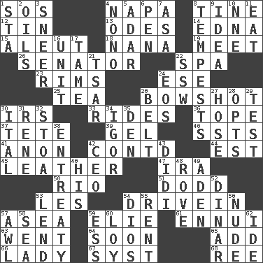 ACROSS 1. Distress signal 4. California wine valley 8. Prong on a fork 12. Shallow baking pan 13. Lyric poems 14. Pulitzer Prize-winning author Ferber 15. Eskimo relative 18. Nanny 19. Rendezvous 20. Elected representative 22. Health resort 23. Basketball hoops 24. Compass dir. 25. Afternoon social gathering 26. The distance a bow sends an arrow 30. Big collection agency 33. Amusement-park features 36. Drink excessively 37. Wig 39. Set 40. Fast planes 41. At once, immediately (arch.) 42. Continued (abbr.) 44. Eastern Standard Time (abbr.) 45. Cordwainer's material 47. Retirement account (abbr.) 50. River (Sp.) 51. Texas town _ City 53. French article 54. Popular '50s hangout 57. Toward the sea 59. Writer Wiesel 61. World-weariness 63. Gone 64. Within a short period 65. Find the sum of 66. Kenny Rogers chart-topper in '80 67. System (abbr.) 68. To separate or throw off DOWN 1. R.R. building 2. Lubricates 3. Scornful expression 4. Words to Nanette 5. The sixth month of the Jewish calendar 6. Writing instrument 7. White ___ sheet 8. Storms 9. It may be bright or harebrained 10. Compass dir. 11. Ingest 16. A single undivided whole 17. Not wild 21. Russian ruler of old 22. Compass dir. 24. Greek goddess of the dawn 26. Waist strap 27. Flexible conduit 28. Elects 29. Trial 30. Slanted text style (abbr.) 31. French philosopher Descartes 32. Portico 34. Composer Stravinsky 35. Lair 38. Plea 42. Corporate head (abbr.) 43. "You Light Up My Life" star Conn 46. Part of HMS, perhaps 48. Be footloose 49. An important port of Yemen 52. Middle Eastern gold or silver currency 53. Grant temporary use of 54. "Vaya con ____" 55. Monthly bill 56. Naked 57. Leather borer 58. Ocean 59. Curvy letter 60. Myrna of the movies 62. Binary compound