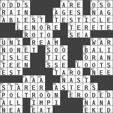 ACROSS 1. Probability 5. "We ___ not amused" (Victoria) 8. Bear (Spanish) 11. Precipitation 12. Matures 13. Tired old horse 14. Most capable 17. A testis 19. Poe poem 21. Cylindrical with tapered ends 22. Printing process, for short 23. Ocean 24. University (slang) 27. 480, 500 or 516 sheets of paper 29. Armed conflict 32. Music written for nine 34. "Barney Miller" actor Jack 36. Indonesian resort city 37. Capri or Wight 38. Nervous spasm 39. Northwest Algerian city 40. Adolescent 41. Compass dir. 42. Plunders 43. Eastern Standard Time (abbr.) 44. Edible starchy tuberous root 46. Born 47. American Automobile Association (abbr.) 50. Political cartoonist Thomas 52. A viewer who gazes fixedly 55. Michaelmas daisies 57. Characterized by complete cowardliness 59. Eaten away 62. 100% 63. Body of Kaffir warriors 64. Grandmother 65. Teachers' org. 66. Consume 67. Made supply last DOWN 1. Mouth or opening 2. Apply (a substance) by light strokes 3. Deli pickle 4. Contemptuous expression 5. Ripen 6. Musical pauses 7. First name in cosmetics 8. At one time in the past 9. Table seasoning 10. Double curve, resembling the letter S 12. Had dinner 15. Derisive sound 16. Haul 18. Retirement account (abbr.) 20. Exposes to great heat 24. Join together 25. Olfactory organs 26. An arm off of a larger body of water 28. Wet 29. Make _____ (do battle with) 30. Having winglike extensions 31. Remove soap 33. Car or cant ending 35. Seas 36. Sometimes accompanies a hiss 42. Failure 45. Assign a rank or rating to 47. Nonscientific branch of learning 48. Nest on high 49. Scent 51. Heavy duty weighing machine 52. Connect, as a bridge 53. Lacquered or enameled metalware 54. Silent film actress Nazimova 55. Cuckoo 56. Neighbor of Neb. 58. Choose 60. Compass dir. 61. Male parent