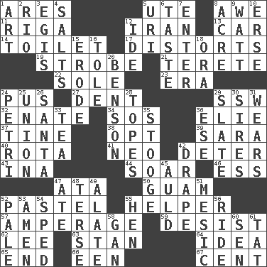 ACROSS 1. Ancient Greek god of war 5. Shoshoni 8. Deep reverence 11. Port city in Latvia 12. SW Asia republic 13. 4-wheeled motor vehicle 14. Bathroom plumbing fixture 17. What propaganda does 19. Disco prop 21. Cigar-shaped 22. Flatfish 23. Epoch 24. Product of festering 27. Gouge 29. Compass dir. 32. Related on the mother's side 34. Mayday 36. Writer Wiesel 37. Prong on a fork 38. Elect 39. "Two Mules for Sister ____" 40. Roll call or roster of names 41. Modern: prefix 42. Prevent from occurring 43. _ tizzy (2 wds.) 44. Fly high 46. Double-curved letter 47. "One Day ___ Time" 50. Island territory of the United States 52. Soft color 55. Aide 57. Electrical Measurement 59. Stop 62. Area sheltered from the wind 63. Comedian Laurel of Laurel & Hardy 64. The content of cognition 65. Conclusion 66. Car or cant ending 67. Penny DOWN 1. Nonscientific branch of learning 2. River (Sp.) 3. The front part of a cuirass 4. Table seasonings 5. RI univ. 6. Clothes sense 7. Keyboard key 8. Land measure 9. Electrical Unit 10. Celtic language 12. Binary compound 15. Eat (away) 16. Lacquered or enameled metalware 18. Mouth or opening 20. Gillaume's butler role 24. _ dish (used to culture cells) 25. The state of being joined or united 26. Before Barbara or Clara 28. Drinks excessively 29. Chalkboard 30. Male parents of animals 31. Erodes 33. Beverage made from leaves 35. Moe Howard, for one 36. Compass dir. 42. Window treatment 45. Old (Scot.) 47. Had dinner 48. Laconic 49. Having winglike extensions 51. Mesonic 52. Light colored 53. So be it 54. Broke a traffic law 55. Layer 56. Travel on an animal 58. Separate the seeds from cotton 60. Elected rep. 61. Make lace