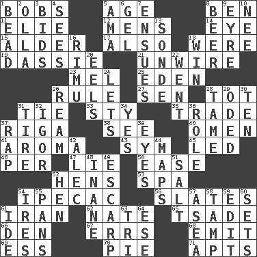 ACROSS 1. Moves up and down 5. Ripen 8. Benjamin's nick name 11. Writer Wiesel 12. Not women's 14. Sight organ 15. Tree or shrub in the Birch family 17. In addition 18. We are 19. Small ungulate mammals of Africa 21. Undo the wiring of 23. Cartoonist voice _ Blanc 25. Genesis locale 26. Court order 27. Elected rep. 28. Small child 31. Make a knot 33. Filthy place 35. Exchange 37. Capital of Latvia 38. Perceive with the eye 40. Presage 41. Scent 43. Symbol (abbr.) 45. Directed 46. For each 47. Whopper 50. Relaxation 52. Coop moms 53. Health resort 54. Medicinal drug used to evoke vomiting 56. Chalkboards 61. SW Asia republic 62. Nathan's nickname 65. Sadhe (variant) 66. Lair 67. Blunders 68. Send forth 69. Curvy letter 70. Sliced dessert 71. Tenement units (abbr.) DOWN 1. Necklace unit 2. Water jar 3. Auction offers 4. Perceives with the eye 5. Housemaid (var.) 6. Set 7. Takes place subsequently 8. Fermented drink made from hops 9. Jane of fiction 10. Born 13. Something which is sent 16. Tall New Zealand timber tree 18. Victory 20. Snakelike fish 22. Left 24. Allows 26. 480, 500 or 516 sheets of paper 28. Not wild 29. Wrote a lyric poem 30. Nine, plus one 31. Hoop that covers a wheel 32. Russian composer Stravinsky 34. Affirmative reply 36. Hero or heavy, e.g. 37. Reproach for some lapse or misdeed 39. Sight organs 42. Actor Baldwin 44. Atlas contents 48. Empty; void 49. Fortification 51. Table seasoning 52. Layer 54. Angers 55. Zero-star reviews 57. Toward the sea 58. Pack (down) 59. Prepare for publication 60. Arranges properly for use 61. Binary compound 63. Three (prefix) 64. Compass dir.