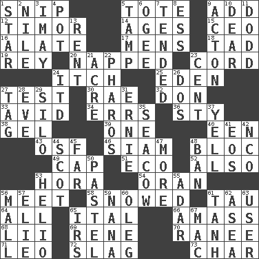 ACROSS 1. Sever or remove by pinching or nipping 5. Carryall 9. Increase 12. The easternmost of the Lesser Sundas 14. Grows older 15. Corporate head (abbr.) 16. Having winglike extensions 17. Not women's 18. Bit 19. Marina Del _, California 20. Slept 23. Drawstring 24. Hankering 25. Locale of original sin 27. Trial 30. Actress Charlotte 32. Spanish title 33. Enthusiastic 34. Blunders 36. Filthy place 38. Set 39. Single 40. Car or cant ending 43. Order of Saint Francis (abbr.) 46. Thailand, formerly 48. Group of countries in special alliance 49. Head covering 51. Environmental prefix 52. In addition 53. Israeli folk dance 54. Northwest Algerian city 56. Confront 58. Overwhelmed 61. The 19th letter of the Greek alphabet 64. 100% 65. Slanted text style (abbr.) 66. Collect or gather 68. Cards in a Roman deck? 69. French philosopher Descartes 70. The wife of a rajah (variant) 71. Lion 72. Volcanic refuse 73. Burn to charcoal DOWN 1. Play the lead 2. "Death on the ____" 3. "If ____ say so..." 4. Plant holder 5. Pack (down) 6. Double curve, resembling the letter S 7. Watched over 8. Curvy letter 9. 13-14th century defensive garment 10. Letter starter 11. Texas town _ City 13. Monthly bill 21. Land measure 22. N Egypt peninsula 23. Penny 24. It would 26. Two (Sp.) 27. Label 28. Night before a holiday 29. Grain storage tower 31. Bert's buddy 35. Manatee 37. Shout 41. Greek goddess of the dawn 42. Non-commissioned officer (abbr.) 44. Highlander 45. At a great distance 47. Greater amount 48. Forbid 50. Soft color 53. Sun: prefix 55. The sixth month of the Jewish calendar 56. Promenade 57. Writer Wiesel 59. Grandmother 60. Cassini of fashion 61. Hyperbolic tangent 62. Toward the sea 63. One who makes use of a thing 65. Big collection agency 67. Apple computer (short form)