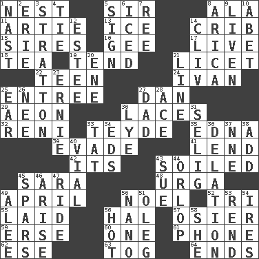 ACROSS 1. A home for chicks 5. Title for a knight 8. Insect wing 11. Nick name for Arthur 13. Frozen water 14. Baby bed with high sides 15. Begets 16. Unit of force equal to gravity 17. Not recorded 18. Afternoon social gathering 19. Watch over 21. It is permitted: Lat. 22. Adolescent 24. "Terrible" tsar 25. Main course 27. One of the 12 tribes of Israel 29. Period of immesurable duration 30. Shoestrings 32. Painter Guido (1575-1642) 33. Miss Universe 1986, Barbara Palacios _ 35. Pulitzer Prize-winning author Ferber 39. Elude 41. Grant temporary use of 42. It is 43. Dirtied 45. "Two Mules for Sister ____" 48. Capital and largest city of Mongolia 49. Showery time 50. Christmas carol 52. Three (prefix) 55. Put down 56. Actor Linden 57. Flexible twig of a willow tree 59. Celtic language 60. Single 61. Give a jingle 62. Compass dir. 63. Coat; cloak 64. Extremities DOWN 1. Political cartoonist Thomas 2. 4th largest of the Great Lakes 3. Ski resort town in Vermont 4. Make a knot 5. Public display of a written message 6. On the rocks 7. To sift 8. N. Chile seaport 9. Make or become more lively 10. Collude with 12. First name in cosmetics 14. 154 in Roman numerals 20. Compass dir. 21. Actor's bit 23. Bert's buddy 25. Ewer handle 26. Born 27. June honoree 28. Adept person 30. Potassium hydroxide 31. Major League Baseball Commissioner Bud 33. Make lace 34. Begley and Asner 36. Accusation by an informer 37. Compass dir. 38. Say or write further 40. Small bottle 43. Take to court 44. Fourth or lowest deck 45. Practice fights 46. Get up 47. Travel on an animal 49. Toward shelter 50. Billionth: prefix 51. Cassini of fashion 53. Tear apart 54. Angers 56. Being at a high temperature 58. A female animal or person