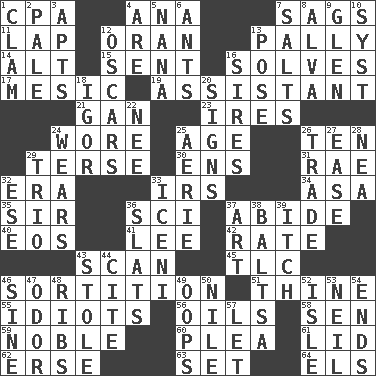 ACROSS 1. Numbers guy (abbr.) 4. Santa ___, CA 7. Droops 11. Infant locale 12. NW Algerian seaport 13. Chummy 14. Keyboard modifier key 15. Transmitted 16. Finds the solution 17. Mesonic 19. Helper 21. Separate the seeds from cotton 23. Angers 24. Had on 25. Ripen 26. "___ Little Indians" 29. Laconic 30. Followers of ems 31. Actress Charlotte 32. Period 33. Big collection agency 34. White ___ sheet 35. Title for a knight 36. _-fi 37. Stay 40. Greek goddess of the dawn 41. Area sheltered from the wind 42. Pace 43. Examine hastily 45. Affectionate concern, for short 46. Making a chance decision by using lots 51. One or ones belonging to thee 55. Foolish or stupid persons 56. Lubricates 58. Elected rep. 59. Impressive in appearance 60. Entreaty 61. Flaplike covering 62. Celtic language 63. Arrange properly for use 64. Raised railways DOWN 1. Dollar (slang) 2. Light colored 3. Flats, for short 4. "We ___ not amused" (Victoria) 5. Nanny 6. Pismires 7. Table seasonings 8. Inventor's middle name 9. Small, secluded valley 10. System (abbr.) 12. Motion picture awards 13. Airs 16. Founders of families 18. Composer Stravinsky 20. Omens 22. Born 24. Erodes 25. Nest on high 26. Swap 27. Relaxation 28. Teachers' org. 29. Musical group of three 32. Compass dir. 33. Ancient Celtic tribe of eastern Britain 36. Narrow boards 37. Tate display 38. Greek mezzo-soprano Agnes 39. Hankering 43. Fur scarf 44. Quote 46. Trig term 47. Scent 48. Chest bones 49. I made a mistake 50. "Death on the ____" 52. Small island 53. Famous astronaut Armstrong 54. Conclusions 57. Allow