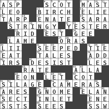 ACROSS 1. Viper 4. Native of Scotland 8. Vertical spar for supporting sails 12. Lion 13. A tree used for making furniture 14. Writer Wiesel 15. Canvas cover 17. Maternal 18. "Two Mules for Sister ____" 19. Slender, wiry 21. Of or pertaining to yesterday 23. To free from 24. Eastern Standard Time (abbr.) 26. Unit of force equal to gravity 27. Unable to walk 28. Mouths or openings 30. Cards in a Roman deck? 31. Oozed 34. Standoff 37. Ingest 38. Falsehoods 39. Find the sum of 40. Big collection agency 41. Stop 42. French article 43. Assign a rank or rating to 44. Silent film actress Nazimova 46. A really long time 47. Allow 50. Small bed 51. Fodder prepared in a silo 54. Devices for capturing images 57. Ancient Greek god of war 58. Dwarf 60. Enthusiasm 62. Religious group 63. An arm off of a larger body of water 64. Compass dir. 65. Fast planes 66. Perceives with the eye 67. Compass dir. DOWN 1. Keyboard modifier key 2. Oceans 3. Likenesses of persons 4. Burn superficially 5. Trading vessels 6. Sep. follower 7. Those people 8. Makes clutter 9. Having winglike extensions 10. Male parent of an animal 11. Rend 13. Benjamin's nick name 16. Demure 20. Binary compound 22. Mild oath 25. Drinks excessively 27. One who doesn't tell the truth 29. Relief 30. Luau accessory 31. Proofreading order 32. Artist's stand 33. Biblical high priest 34. Baron Munchausen's specialties 35. The content of cognition 36. Begley and Asner 41. Mild oath, euphamism for damn 43. Cooks with dry heat, as in an oven 44. Adept person 45. Old wives' tales, e.g. 46. Opt 48. Learning spot: Fr. 49. Domesticates 51. Backtalk 52. Angers 53. The front part of a cuirass 55. Was introduced to 56. Without 59. Compass dir. 61. ___ Haven, CT