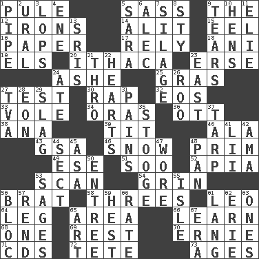 ACROSS 1. Whimper 5. Backtalk 9. Definite Article 12. Metal shackles 14. Came down and settled, as after flight 15. Snakelike fish 16. Some stationery 17. Depend 18. Black tropical American cuckoo 19. Raised railways 20. New York city 23. Celtic language 24. American tennis player Robert 25. Pate de foie ____ 27. Trial 30. Strike 32. Greek goddess of the dawn 33. Short-tailed, large-bodied rat 34. Mouths or openings 36. Baseball player Mel 38. Santa ___, CA 39. Teat (slang) 40. Insect wing 43. Girls' org. (abbr.) 46. Overwhelm 48. Demure 49. Compass dir. 51. "Barney Miller" actor Jack 52. Capital of Western Samoa 53. Skim 54. Broad smile 56. Naughty child 58. Trios 61. Lion 64. Part of a journey 65. Type of rug 66. Acquire or gain knowledge or skills 68. Single 69. Repose 70. Bert's buddy 71. Music discs 72. Wig 73. Matures DOWN 1. Corncob 2. Mountain range 3. Chops off 4. Compass dir. 5. "Two Mules for Sister ____" 6. Actor Baldwin 7. Fodder prepared in a silo 8. Filthy place 9. Pulls into pieces 10. Coop moms 11. Writer Wiesel 13. Indian titles of respect 21. Through, poetically 22. Centers of feelings and intuitions 23. 90 degrees 24. Had dinner 26. Friend of Pooh 27. Federal power corp. 28. A really long time 29. Volcanic refuse 31. Aches 35. Moe Howard, for one 37. Canvas cover 41. Cards in a Roman deck? 42. Nursemaid (var.) 44. Religious group 45. White ___ sheet 47. Had on 48. Baking dish 50. Main course 53. Gurus 55. Capri or Wight 56. Coalition 57. Tear apart 59. Command 60. Assign a rank or rating to 61. Austrian-born American filmmaker Fritz 62. One of the Great Lakes 63. Singles 65. Nonscientific branch of learning 67. Epoch