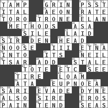 ACROSS 1. Pack (down) 5. Smile widely 9. Inconspicuous attention getter 13. Slanted text style (abbr.) 14. Period of immesurable duration 15. Assign a rank or rating to 16. "Corrida" creature 17. Heavy duty weighing machine 18. Flair 19. Modes 21. White ___ sheet 22. Filth; sediment 23. Put down 24. Title for a knight 27. Lair 28. Froth on beer 29. Trap for birds or small mammals 31. One more than two 32. Inactive volcano in Sicily 36. To the inside or interior of 37. It is 38. Famous astronaut Armstrong 39. Russian ruler of old 40. Find the sum of 41. Having lost freshness 42. Lug 44. And so on (abbr.) 46. Perceive with the eye 47. Become fatigued 48. Rich soil 50. _ moment's notice (2 wds.) 51. Normal relaxed breathing 54. Indian skirt 56. Dodge 58. Unit of force 60. In addition 61. The founder of a family 62. Greek god of love 63. Ache 64. Watch over 65. Oceans DOWN 1. Teat (slang) 2. Smallest unit of an element 3. Female horse 4. Small pieces of grounds 5. Place where plants grow 6. Vintage cars 7. Electrically charged atom 8. Compass dir. 9. Elected leader of a country 10. First course 11. R.R. building 12. "___ Little Indians" 17. Lacquered or enameled metalware 20. Flintstone garb 21. Auto club (abbr.) 23. Flowery wreath 24. In a ____ (agitated or irritated) 25. Charged particles 26. Round or rotation of duties 28. Part of HMS, perhaps 30. Conclusion 31. It would 33. Afternoon social gatherings 34. "Death on the ____" 35. Toward shelter 37. Binary compound 40. Had dinner 41. Skim 43. Mouth or opening 44. Evaded 45. Drink excessively 47. Tarsus (plural) 49. Methods 51. Merit 52. Jane of fiction 53. Small Philippine buffalo 54. Plant excrement 55. Insect wing 56. Eastern Standard Time (abbr.) 57. Compete 59. Double-curved letter