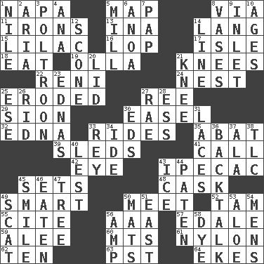 ACROSS 1. California wine valley 5. Atlas unit 8. By way of 11. Metal shackles 13. _ tizzy (2 wds.) 14. Long (Scottish) 15. Pale purple color 16. Chop off 17. Capri or Wight 18. Erode 19. Spanish pot 21. Leg joints 22. Painter Guido (1575-1642) 24. Egg locale 25. Worn away 27. Portuguese money of account (variant) 29. The Jewish people; Israel 30. Artist's stand 32. Pulitzer Prize-winning author Ferber 33. Amusement-park features 35. Blind as ____ 39. Bobsleighs 41. Give a ring to 42. Sight organ 43. Medicinal drug used to evoke vomiting 45. Arranges properly for use 48. Keg 49. Don Adams' spy role 50. Confront 52. Scottish cap 55. Quote 56. Auto club (abbr.) 57. Peak District village in England 59. Toward shelter 60. Mountains (abbr.) 61. High-strength synthetic material 62. "___ Little Indians" 63. Pacific Standard Time (abbr.) 64. Supplements with great effort DOWN 1. The longest river in the world 2. Roberta Peters solo 3. Coward 4. Santa ___, CA 5. Place where flour is made 6. Small Philippine buffalo 7. Infant food 8. Flower holders 9. An arm off of a larger body of water 10. Matures 12. Biscuitlike quick bread 14. Actor's bit 20. Hat (slang) 21. Leg joint 23. Ferber et al. 25. Compass dir. 26. To free from 27. Actress Charlotte 28. Curvy letter 30. Begley and Asner 31. Shoestrings 33. Marina Del _, California 34. Binary compound 36. Sass 37. According to 38. Affectionate concern, for short 40. For fear that 43. Frozen water 44. Eucharist need 45. Grin 46. Ingested 47. Family _ (genealogy) 49. Jazz singing style 50. Floor coverings 51. Compass direction 53. _ vera 54. Not women's 56. Electrical Unit 58. Color
