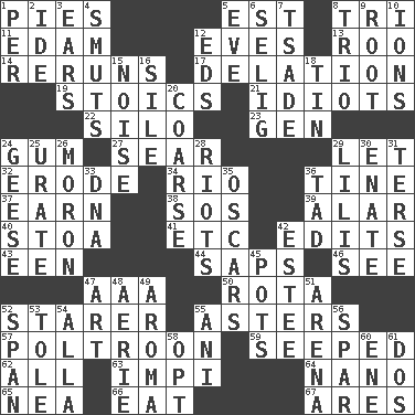 ACROSS 1. Sliced desserts 5. Eastern Standard Time (abbr.) 8. Three (prefix) 11. Dutch treat 12. Nights before holidays 13. Friend of Pooh 14. Summer TV shows 17. Accusation by an informer 19. Unemotional ones 21. Foolish or stupid persons 22. Grain storage tower 23. Commissioned military rank (abbr.) 24. Chewing product 27. Wither 29. Allow 32. Wear away 34. _ de Janeiro 36. Prong on a fork 37. Merit 38. Mayday 39. Having or resembling wings 40. Portico 41. And so on (abbr.) 42. Prepares for publication 43. Car or cant ending 44. Plant excrements 46. Perceive with the eye 47. Auto club (abbr.) 50. Roll call or roster of names 52. A viewer who gazes fixedly 55. Michaelmas daisies 57. Characterized by complete cowardliness 59. Oozed 62. Everything 63. Body of Kaffir warriors 64. Billionth: prefix 65. Teachers' org. 66. Consume 67. Ancient Greek god of war DOWN 1. For each 2. Binary compound 3. Hearing organs 4. Particles of soot 5. Night before a holiday 6. Major League Baseball Commissioner Bud 7. Sadhe (variant) 8. Musical group of three 9. Carrot, for example 10. Charged atoms 12. Begley and Asner 15. Annoying sound 16. Filth; sediment 18. Shallow baking pan 20. Unrefined 24. Honkers 25. A salt of uric acid 26. Person of subnormal intelligence 28. Disturbances 29. Ms. Damita and namesakes 30. Related on the mother's side 31. Laconic 33. Heredity factor (abbr.) 35. Motion picture awards 36. Small boy 42. First name in cosmetics 45. Plant holders 47. Tate display 48. Nest on high 49. Scent 51. Sports stadium 52. Connect, as a bridge 53. Lacquered or enameled metalware 54. Silent film actress Nazimova 55. Cuckoo 56. Practice fight 58. Choose 60. Compass dir. 61. Two (Sp.)