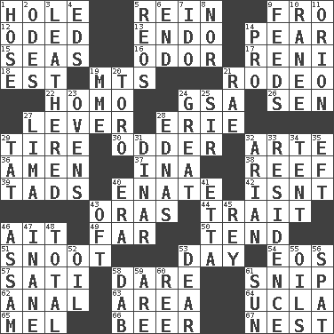 ACROSS 1. Opening into or through something 5. It's straight from the horse's mouth 9. Back 12. Wrote a lyric poem 13. Inside; within (prefix) 14. Lightbulb-shaped fruit 15. Oceans 16. Aroma 17. Painter Guido (1575-1642) 18. Eastern Standard Time (abbr.) 19. Mountains (abbr.) 21. Cowboy competition 22. Like (prefix) 24. Girls' org. (abbr.) 26. Elected rep. 27. Crowbar 28. One of the Great Lakes 29. Hoop that covers a wheel 30. More peculiar 32. Johnson of "Laugh-In" 36. So be it 37. _ tizzy (2 wds.) 38. Coral ridge 39. Small boys 40. Maternal 42. Is not 43. Mouths or openings 44. Distinguishing feature 46. Small island 49. At a great distance 50. Watch over 51. Snout, nose 53. 24 hours 54. Greek goddess of the dawn 57. Suttee (variant) 58. Have the gumption 61. Clip 62. Of or related to the anus 63. Length times width 64. Southern CA. univ. 65. Cartoonist voice _ Blanc 66. Fermented drink made from hops 67. Egg locale DOWN 1. Stockings 2. Lyric poems 3. Tough but pliablecoriaceous 4. Begley and Asner 5. Vintage cars 6. Conclusion 7. Wedding promise 8. And not 9. Eats 10. The wife of a rajah (variant) 11. Constellation of myth 14. Adept person 19. Madame (abbr.) 20. "Corrida" creature 21. Actress Charlotte 23. Baking chambers 24. Relatively large 25. Title for a knight 27. Pale green bean 28. Ferber et al. 29. Make lace 31. Middle Eastern gold or silver currency 32. Believer in; advocate of (suffix) 33. Dwelling 34. Portable shelter 35. Lizard (obsolete) 40. Epoch 41. Singer James 43. Often (poetically) 45. Marina Del _, California 46. Indian state 47. Lacking in sense or substance 48. "_____ Recall" 52. Petroleum 53. Letter starter 55. Petroleums 56. Argument over a trivial matter 58. Apply (a substance) by light strokes 59. "We ___ not amused" (Victoria) 60. To riddle 61. Player for Phoenix