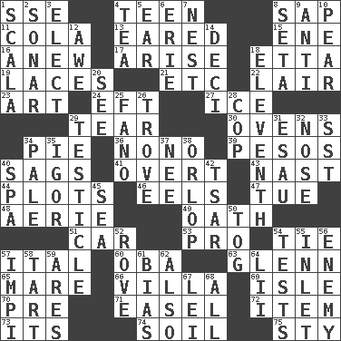 ACROSS 1. Compass dir. 4. Adolescent 8. Plant excrement 11. Root beer relative 13. Having ears or earlike features 15. Compass dir. 16. Afresh 17. Originate 18. Singer James 19. Shoestrings 21. And so on (abbr.) 22. Den 23. Nonscientific branch of learning 24. Newt 27. Frozen water 29. Pull into pieces 30. Baking chambers 34. Sliced dessert 36. Words to Nanette 39. Mexican monetary units 40. Settles 41. Unconcealed 43. Political cartoonist Thomas 44. Schemes 46. Snakelike fish 47. Third day of the wk. 48. Nest on high 49. Pledge 51. 4-wheeled motor vehicle 53. Adept person 54. Make a knot 57. Slanted text style (abbr.) 60. Chief or king in Benin or Nigeria 63. American astronaut and politician John 65. Female horse 66. Country estate 69. Small island 70. Before (prefix) 71. Artist's stand 72. Detail 73. It is 74. Land 75. Filthy place DOWN 1. Any of the three canals of the cochlea 2. Underwater navigation system 3. Voters do this 4. Afternoon social gathering 5. Hearing organ 6. 4th largest of the Great Lakes 7. Egg locale 8. Bristle 9. Against 10. Lightbulb-shaped fruit 12. Deep reverence 14. Tenth: prefix 18. Veterans Day date 20. Perceive with the eye 25. Papal veil 26. Collection of objects 28. Police officer (slang) 29. A testis 31. He sold his birthright 32. Olfactory organ 33. Fast jet (abbr.) 34. Diluted with white 35. Composer Stravinsky 37. Born 38. Lowest deck of a ship 40. Health resort 42. Russian ruler of old 45. Ocean 50. Coat; cloak 52. Be footloose 54. Trials 55. An arm off of a larger body of water 56. Foe 57. Body of Kaffir warriors 58. Small pie 59. Ancient Greek god of war 61. Prejudice 62. In addition 64. Cards in a Roman deck? 67. Flowery wreath 68. Everything