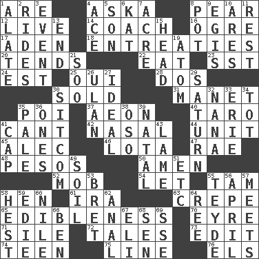 ACROSS 1. "We ___ not amused" (Victoria) 4. "____ silly question..." 8. Lightbulb-shaped fruit 12. Moving, as bait 14. Team commander 16. Legendary monster 17. An important port of Yemen 18. Pleas 20. Looks after 22. Consume 23. Fast jet (abbr.) 24. Eastern Standard Time (abbr.) 25. Fr. "Yes" 28. Two (Sp.) 30. Disposed of to a purchaser 31. French painter Edouard 35. Luau course 37. A really long time 40. Pacific island yam 41. Patter 42. Relating to the nose 44. A single undivided whole 45. Actor Baldwin 46. Globular water bottle used in Asia 47. Actress Charlotte 48. Mexican monetary units 50. So be it 52. Disorderly crowd 54. Allow 55. Scottish cap 58. Layer 61. Lyricist Gershwin 63. Streamer paper 65. The property of being fit to eat 70. Jane of fiction 71. Drop; flow; fall 72. Stories 73. Prepare for publication 74. Adolescent 75. Actor's bit 76. Raised railways DOWN 1. Having winglike extensions 2. Amusement-park features 3. Incident 4. Adept person 5. Male child 6. Krazy ___ of comics 7. 43,560 square feet 8. Cooking vessel 9. The front part of a cuirass 10. Ancient Greek god of war 11. Respite 13. Conclusion 15. Froth on beer 19. Tiny particle 21. "Barney Miller" actor Jack 26. Uhlan (variant) 27. Perfect 29. Titan orbits this 30. "Cheers" or "Ellen" 32. Nanny 33. One of the Great Lakes 34. Small child 35. Light colored 36. Washington bills 38. Bear (Spanish) 39. Brizilian seaport 41. Head covering 43. Unable to walk 49. Land 51. And so on (abbr.) 53. Cy Young winner Saberhagen 55. Miss Universe 1986, Barbara Palacios _ 56. Showery time 57. Confronts 58. Behest 59. Singer Brickell 60. Mediterranean tributary 62. Of or related to the anus 64. To separate or throw off 66. Benjamin's nick name 67. Connecticut Ivy Leaguer 68. Elected rep. 69. Compass dir.