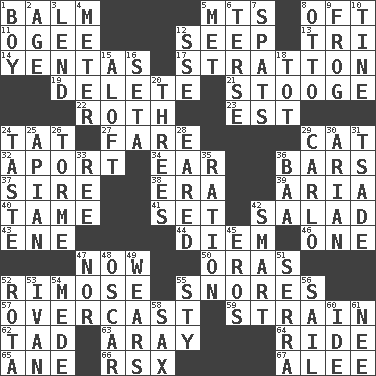 ACROSS 1. Lip ointment 5. Mountains (abbr.) 8. Often (poetically) 11. Double curve, resembling the letter S 12. Ooze 13. Three (prefix) 14. Gossips 17. Ski resort town in Vermont 19. Erase 21. Moe Howard, for one 22. Writer of Portnoy's Complaint (1969) 23. Eastern Standard Time (abbr.) 24. Make lace 27. Conductor's collection 29. Domesticated feline 32. To the left, to Queeg 34. Ewer handle 36. Oblong pieces of solid material 37. Father 38. Epoch 39. Roberta Peters solo 40. Docile 41. Arrange properly for use 42. Vegetable dish 43. Compass dir. 44. South Vietnam president (1954) 46. Single 47. Immediately 50. Mouths or openings 52. Full of chinks, cracks, or crevices 55. Sounds asleep 57. Cloudy 59. Put through a sieve 62. Small boy 63. Like ___ of sunshine 64. Travel on or in a vehicle 65. A saturated hydrocarbon 66. Acura sports coupe 67. Toward shelter DOWN 1. Male child 2. Ripen 3. Grant temporary use of 4. Distance measurement 5. Was introduced to 6. Laconic 7. Arguments over trivial matters 8. Von Bismarck 9. Toadlike animal 10. Prong on a fork 12. Compass dir. 15. At or to great height 16. Stalk of a moss capsule 18. Small child 20. Threesomes 24. Clothes sense 25. Bee-related 26. Singer Mel 28. Having ears or earlike features 29. Monte _, Las Vegas Hotel/Casino 30. Believer in; advocate of (suffix) 31. Sadhe (variant) 33. To sift 35. Food allowance for one day 36. Sound made by sheep 42. Don Adams' spy role 45. Greek god of love 47. And not 48. Witty Wilde 49. Puts on (as clothing) 51. Father Junipero _ 52. Round or rotation of duties 53. "Terrible" tsar 54. Ancient Persian 55. Filthy place 56. Move on water 58. Saxophone 60. Binary compound 61. Born