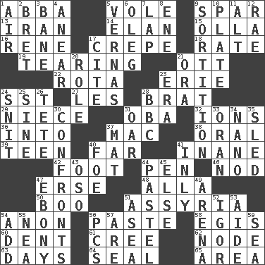 ACROSS 1. Swedish rock group 5. Short-tailed, large-bodied rat 9. Practice fight 13. SW Asia republic 14. Enthusiasm 15. Spanish pot 16. French philosopher Descartes 17. Streamer paper 18. Assign a rank or rating to 19. Lacerating 21. Baseball player Mel 22. Round or rotation of duties 23. 4th largest of the Great Lakes 24. Fast jet (abbr.) 27. French article 28. Naughty child 29. Sibling's daughter 31. Chief or king in Benin or Nigeria 32. Charged atoms 36. To the inside or interior of 37. Apple computer (short form) 38. Spoken 39. Adolescent 40. At a great distance 41. Empty; void 42. Pick up the tab 44. Fenced enclosure 46. Lower and raise head in agreement 47. Celtic language 48. Silent film actress Nazimova 50. Surprise greeting 51. Nineveh was its capital 54. Soon (poet.) 56. Thick mixture 58. The front part of a cuirass 60. Undesirable depression on a surface 61. Algonquian 62. Connecting point 63. 24-hour periods 64. Lick closed 65. Type of rug DOWN 1. Atmosphere 2. Cy Young winner Saberhagen 3. Object of repulsion 4. Approach 5. Actresses Bloom and Felton 6. Cassini of fashion 7. Pet locale 8. Compass dir. 9. Casting lots 10. Food holder 11. The first octave above the treble staff 12. Actress Charlotte 17. Quote 20. Hero or heavy, e.g. 21. Mouth or opening 23. Period 24. In a ____ (agitated or irritated) 25. Trig term 26. False hair 28. English channel? 30. Meets 31. Boat paddle 33. Northwest Algerian city 34. Billionth: prefix 35. Downhill vehicle 37. Floor covering 40. Enemy 41. Inwardly 43. Bear (Spanish) 44. Soft color 45. Otherwise 47. Dark wood 49. Sports stadium 51. Toward the sea 52. Composer Stravinsky 53. Assistant 54. Find the sum of 55. Teachers' org. 56. Personal Computers (abbr.) 57. "We ___ not amused" (Victoria) 59. Ocean