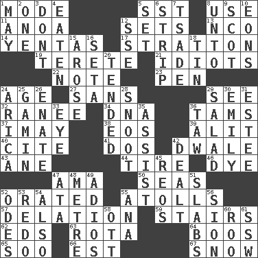 ACROSS 1. Method 5. Fast jet (abbr.) 8. Purpose 11. Small Philippine buffalo 12. Puts into a specified state 13. Non-commissioned officer (abbr.) 14. Gossips 17. Ski resort town in Vermont 19. Cigar-shaped 21. Foolish or stupid persons 22. Short letter 23. Animal enclosure 24. Ripen 27. Without 29. Perceive with the eye 32. Indian princess (variant) 34. Heredity factor (abbr.) 36. Scottish caps 37. "If ____ say so..." 38. Greek goddess of the dawn 39. Came down and settled, as after flight 40. Quote 41. Two (Sp.) 42. A sleeping potion; an opiate (poet.) 43. A saturated hydrocarbon 44. Hoop that covers a wheel 46. Color 47. Housemaid (var.) 50. Oceans 52. Declaimed 55. Ringlike coral islands and reefs 57. Accusation by an informer 59. Flight of steps 62. Begley and Asner 63. Round or rotation of duties 64. Scornful sounds 65. "Barney Miller" actor Jack 66. Eastern Standard Time (abbr.) 67. Frozen precipitation DOWN 1. Fifth month 2. Single 3. Do not 4. Consumed 5. Put into a specified state 6. Empty completely 7. Sadhe (variant) 8. To (old English) 9. Highlander 10. Immeasurably long periods of time 12. Compass dir. 15. Came up 16. Stalk of a moss capsule 18. Metal container 20. Watched over 24. N. Chile seaport 25. Street urchin 26. Related on the mother's side 28. Snout, nose 29. Vegetable dish 30. Poet Dickinson 31. First name in cosmetics 33. Sight organ 35. Help 36. The 23rd letter of the Hebrew alphabet 42. Started a card game 45. Vintage cars 47. "One Day ___ Time" 48. Distance measurement (Brit.) 49. Goodbye (Sp.) 51. Broad, flat, thick pieces 52. Lyric poems 53. Make new 54. In addition 55. Santa ___, CA 56. The Jewish people; Israel 58. Baseball player Mel 60. Friend of Pooh 61. Compass dir.