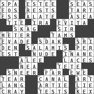 ACROSS 1. Health resort 4. First name in cosmetics 9. Oceans 13. Greek goddess of the dawn 14. Musical pauses 15. Small pie 16. Double-curved letter 17. Having winglike extensions 18. Toward the sea 19. Make a knot 21. Retirement account (abbr.) 22. Webber/Rice musical 24. Heroin 26. Title for a knight 27. Distance measurement 29. Scottish caps 30. Dodge 31. Neighbor of Neb. 33. _ Lanka 36. Lair 37. Deli grouping 40. For each 41. Eastern Standard Time (abbr.) 42. Unadorned 43. Silly 45. Toward shelter 47. Shoestrings 48. Teachers' org. 49. Wig 50. Contemptuous expression 52. At a great distance 54. She-sheep 56. Pull apart 57. Lessep's creation 59. Nonscientific branch of learning 61. Austrian-born American filmmaker Fritz 62. Nick name for Arthur 63. Untruth 64. Supercomputer manufacturer 65. Trials 66. Dry husk or covering DOWN 1. Observe 2. Mail 3. Helper 4. Epoch 5. Former Milwaukee Brewers owner Bud 6. Russian ruler of old 7. Singer James 8. Compass dir. 9. Flight of steps 10. Compass direction 11. Type of rug 12. R.R. building 20. Made supply last 22. 1973 Nobel Price Winner (Physics) Leo 23. Zeal 25. Ancient Greek god of war 27. Ancient Persian 28. Nights before holidays 29. Docile 31. Turn sharply 32. June honoree 33. High altitude stroll 34. French philosopher Descartes 35. Angers 38. Approach 39. Drop; flow; fall 44. Nathan's nickname 45. Disorder of the immune system 46. Area sheltered from the wind 49. Distinguishing feature 50. Wither 51. Grandmother 52. Conductor's collection 53. Pismires 55. 4th largest of the Great Lakes 56. Affectionate concern, for short 57. Domesticated feline 58. French article 60. John Ritter's dad