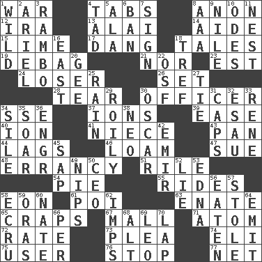 ACROSS 1. Armed conflict 4. Bar bills 8. At once, immediately (arch.) 12. Retirement account (abbr.) 13. Jai _ 14. Helper 15. Citrus frut 17. Mild oath, euphamism for damn 18. Falsehoods 19. Debunk (Brit. slang) 21. And not 23. Eastern Standard Time (abbr.) 24. Failure 26. Arrange properly for use 28. Pull apart 30. Person of authority 34. Compass dir. 37. Charged particles 39. Comfort 40. Electrically charged atom 41. Sibling's daughter 43. Baking dish 44. Falls behind 46. Rich soil 47. Institute legal proceedings 48. The state or an instance of erring 51. Cause heat under the collar 54. Sliced dessert 55. Amusement-park features 58. Period of immesurable duration 61. Luau course 63. Maternal 65. Dice game 67. Shopping center 71. Smallest unit of an element 72. Pace 73. Entreaty 74. Biblical high priest 75. One who makes use of a thing 76. Close up, plug up 77. Remaining after all deductions DOWN 1. Rampant 2. Satellite of Uranus 3. Role for Stallone 4. Small amount or degree 5. According to 6. Prohibit 7. Public display of a written message 8. Auto club (abbr.) 9. "Death on the ____" 10. Lyric poems 11. A home for chicks 16. Compass direction 18. Unclean, religiously 20. Turn to the right 22. Order of Saint Francis (abbr.) 25. Precipitation 27. Make a knot 29. Agitated, as a liquid 30. Witty Wilde 31. Smile enhancers 32. He sold his birthright 33. French philosopher Descartes 34. Filth; sediment 35. Fly high 36. Engineer (abbr.) 38. Modern: prefix 42. Independent ruler or chieftain 45. Plant excrement 49. Cuts off 50. Corporate head (abbr.) 52. Whopper 53. Pulitzer Prize-winning author Ferber 56. Eroded 57. Fur scarf 58. Shade of tan 59. Mouths or openings 60. Nathan's nickname 62. Naughty children 64. Send forth 66. For each 68. Keyboard modifier key 69. Lion 70. Pet locale