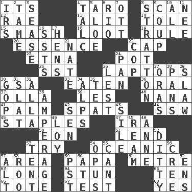 ACROSS 1. It is 4. Pacific island yam 8. Skim 12. Actress Charlotte 13. Came down and settled, as after flight 14. Lacquered or enameled metalware 15. Box-office sellout 18. Spoils 19. Court order 20. Gist 22. Head covering 23. Inactive volcano in Sicily 24. Plant holder 25. Fast jet (abbr.) 26. Portable computers 30. Girls' org. (abbr.) 33. Eroded 36. Of the mouth 37. Spanish pot 39. French article 40. Grandmother 41. Inside of hand 42. Arguments over trivial matters 44. Compass dir. 45. Paper fasteners 47. Lyricist Gershwin 50. Period of immesurable duration 51. Grant temporary use of 53. Attempt 54. Pertaining to the sea 57. Length times width 59. Dad 61. Distance measurement (Brit.) 63. Protracted 64. Make senseless or dizzy 65. Nine, plus one 66. Carryall 67. Trial 68. It is so DOWN 1. Big collection agency 2. Docile 3. Gospel singer Marvin 4. Baby powder 5. _ vera 6. _ de Janeiro 7. Baseball player Mel 8. Ski resort town in Vermont 9. Overturn; upset 10. 100% 11. Born 16. Fast planes 17. Coop moms 21. Nathan's nickname 22. Police officer (slang) 24. Baking dish 26. For fear that 27. Mouths or openings 28. Zero-star reviews 29. Cole _ (cabbage dish) 30. Republicans 31. Narrow board 32. Silent film actress Nazimova 34. High mountains 35. Beverage made from leaves 38. Electrical Measurement 42. Elected rep. 43. Drop; flow; fall 46. Myrna of the movies 48. 480, 500 or 516 sheets of paper 49. Singer Murray 52. Simple song 53. Portable shelter 54. Musical composition 55. Patter 56. Algonquian 57. Keyboard modifier key 58. Friend of Pooh 59. Pacific Standard Time (abbr.) 60. Had dinner 62. Followers of ems