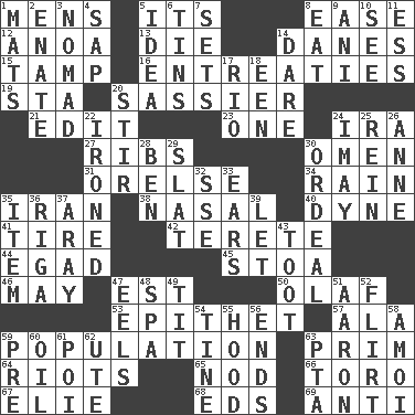 ACROSS 1. Not women's 5. ___ a Wonderful Life 8. Comfort 12. Small Philippine buffalo 13. Pass on 14. Natives or inhabitants of Denmark 15. Pack (down) 16. Pleas 19. R.R. building 20. More lively and spirited 21. Prepare for publication 23. Single 24. Lyricist Gershwin 27. Teases 30. Sign of things to come 31. Threatening words 34. Precipitation 35. SW Asia republic 38. Rhinal 40. Centimeter-gram-second unit of force 41. Hoop that covers a wheel 42. Cigar-shaped 44. Mild oath 45. Portico 46. Can I? 47. Eastern Standard Time (abbr.) 50. Norwegian king 53. Curse 57. In the manner of 59. Census information 63. Demure 64. Disturbances 65. Allow head to fall sleepily 66. "Corrida" creature 67. Writer Wiesel 68. Begley and Asner 69. Opposed to DOWN 1. Floor coverings 2. Maternal 3. Wanderer 4. Plant excrement 5. The main thing one is thinking about 6. Canisters 7. Arranges properly for use 8. Erode 9. Black tropical American cuckoo 10. Perceive with the eye 11. Curvy letter 14. Have the gumption 17. _ de Janeiro 18. Car or cant ending 20. Use a swizzle stick 22. Pressed 24. "If ____ say so..." 25. It's straight from the horse's mouth 26. Singer Murray 28. Benjamin's nick name 29. Narrow board 30. Severe or trying experience 32. Compass dir. 33. Hearing organs 35. A whole individual unit 36. Capital of Latvia 37. Like ___ of sunshine 39. Allow 43. A blast of a horn 47. Snakelike fish 48. Health resort 49. Teat (slang) 51. Composer Copland 52. Talk or behave amorously 54. Prong on a fork 55. Parka part 56. Conclusions 58. Mine, in Marseilles 59. Before (prefix) 60. Petroleum 61. Luau course 62. Shoshoni 63. Parent Teacher Association (abbr.)