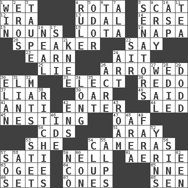 ACROSS 1. Dripping 4. Roll call or roster of names 8. Leave at once 12. Lyricist Gershwin 13. Freehold land 14. Celtic language 15. Parts of speech 18. Globular water bottle used in Asia 19. California wine valley 20. Orator 22. Declare 23. Merit 24. Small island 25. Falsehood 26. Moved like an arrow 30. Shade tree 33. Choose 36. Redecorate 37. One who doesn't tell the truth 39. Boat paddle 40. Expressed in words 41. Against 42. Keyboard key 44. Directed 45. Inhabiting a nest 47. Clumsy lout 50. Music discs 51. Like ___ of sunshine 53. A female animal or person 54. Devices for capturing images 57. Suttee (variant) 59. 1994 drama film starring Jodie Foster 61. Nest on high 63. Double curve, resembling the letter S 64. Overturn; upset 65. Compass dir. 66. Arranges properly for use 67. Washington bills 68. Elected rep. DOWN 1. Victory 2. Greek god of love 3. Grayish beige 4. Governing power 5. Aroma 6. Make lace 7. Chicken ___ king 8. Elected representatives 9. Supercomputer manufacturer 10. Cleo's killer 11. Beverage made from leaves 16. Anneal 17. Indian skirt 21. Leg joint 22. Title for a knight 24. Nonscientific branch of learning 26. Land measure 27. Welt 28. Singer Brickell 29. Texas town _ City 30. Liveliness 31. Actor's bit 32. Floor coverings 34. Having great length 35. Erode 38. Actors Guy, Robert Welles, and Clint 42. Followers of ems 43. Wander 46. Binary compound 48. Type of rug 49. Conductor's collection 52. Tall tales 53. Proofreading order 54. A slight indication 55. High mountains 56. Trig term 57. Distress signal 58. Mature 59. Non-commissioned officer (abbr.) 60. Period of immesurable duration 62. Car or cant ending