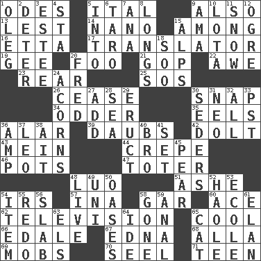 ACROSS 1. Lyric poems 5. Slanted text style (abbr.) 9. In addition 13. For fear that 14. Billionth: prefix 15. Amid 16. Singer James 17. Interpreter 19. Turn to the right 20. Egg _ yung 21. Republican Party 22. Deep reverence 23. Hitchcock's "____ Window" 25. Mayday 26. Desist 30. Fastener 34. More peculiar 35. Snakelike fish 36. Having or resembling wings 39. Applies to a surface 42. Dunce 43. Chow _ 44. Streamer paper 46. Cooking vessels 47. Carrier 48. Nilotic language 51. American tennis player Robert 54. Big collection agency 57. _ tizzy (2 wds.) 58. Slender fish 60. Adept person 62. Household entertainment appliance 65. Calm and collected 66. Peak District village in England 67. Pulitzer Prize-winning author Ferber 68. Silent film actress Nazimova 69. Crowds into 70. Sew up the eyelids of hawks and falcons 71. Adolescent DOWN 1. Cassini of fashion 2. Prevent from occurring 3. First name in cosmetics 4. R.R. building 5. To the inside or interior of 6. Pacific island yam 7. Santa ___, CA 8. Yearns 9. Nursemaid (var.) 10. Globular water bottle used in Asia 11. Frozen precipitation 12. Legendary monster 15. High mountains 18. "Barney Miller" actor Jack 20. Flintstone 24. Oak nuts 27. Increase 28. Ocean 29. Spew [out] 30. Spring feasts 31. Modern: prefix 32. 100% 33. Pacific Standard Time (abbr.) 36. Electrical Unit 37. Lion 38. Small island 40. Sis' sibling 41. Put into a specified state 45. Lightbulb-shaped fruit 48. Moving, as bait 49. Corn or form start 50. Fertile tracts in a desert 52. White Person, in Hawaii 53. Learning spot: Fr. 54. A distinct part 55. Redecorate 56. Thick slice 58. Went 59. Of or related to the anus 61. Liveliness 63. Raised railways 64. Binary compound 65. Feline