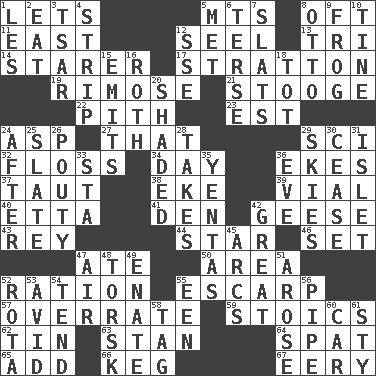 ACROSS 1. Allows 5. Mountains (abbr.) 8. Often (poetically) 11. Compass direction 12. Sew up the eyelids of hawks and falcons 13. Three (prefix) 14. A viewer who gazes fixedly 17. Ski resort town in Vermont 19. Full of chinks, cracks, or crevices 21. Moe Howard, for one 22. Essential or central part 23. Eastern Standard Time (abbr.) 24. Cleo's killer 27. Not this but _ 29. _-fi 32. Soft thread for cleaning between teeth 34. 24 hours 36. Makes supply last 37. Pulled tight 38. Make supply last 39. Small bottle 40. Singer James 41. Lair 42. Honkers 43. Marina Del _, California 44. Play the lead 46. Put into a specified state 47. Had dinner 50. Type of rug 52. Food allowance for one day 55. Fortification 57. Make much ado about nothing 59. Unemotional ones 62. Shallow baking pan 63. Comedian Laurel of Laurel & Hardy 64. Petty quarrel 65. Increase 66. Barrel 67. Suggestive of the supernatural DOWN 1. French article 2. Consume 3. Russian ruler of old 4. Long narrow piece of something 5. Was introduced to 6. Laconic 7. Narrow boards 8. Von Bismarck 9. Toadlike animal 10. Prong on a fork 12. Compass dir. 15. Gives off 16. Writer of Portnoy's Complaint (1969) 18. Small child 20. Cast a shadow over 24. Following 25. Chalkboard 26. Marked by pouting 28. Receives possession of 29. Atmospheres 30. Stop 31. Small island 33. R.R. building 35. Gossips 36. Night before a holiday 42. Relatively large 45. Curves 47. Atmosphere 48. Cod relative 49. Maternal 51. Came up 52. Roll call or roster of names 53. Enthusiastic 54. Watch over 55. Car or cant ending 56. Corncob 58. Label 60. 4-wheeled motor vehicle 61. Filthy place