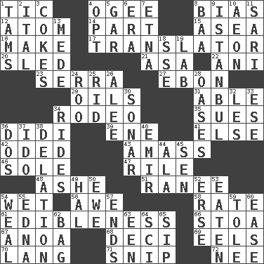 ACROSS 1. Nervous spasm 4. Double curve, resembling the letter S 8. Prejudice 12. Smallest unit of an element 14. Role in a play 15. At sea 16. Create 17. Interpreter 20. Downhill vehicle 21. White ___ sheet 22. Black tropical American cuckoo 23. Father Junipero _ 27. Inky black, to poets 29. Lubricates 31. Competent 34. Cowboy competition 35. Institutes legal proceedings 36. "You Light Up My Life" star Conn 39. Compass dir. 41. Otherwise 42. Wrote a lyric poem 43. Collect or gather 46. Not divided or shared with others 47. Cause heat under the collar 48. American tennis player Robert 51. Indian princess (variant) 54. Dripping 56. Deep reverence 58. Assign a rank or rating to 61. The property of being fit to eat 66. Portico 67. Small Philippine buffalo 68. Tenth: prefix 69. Snakelike fish 70. Austrian-born American filmmaker Fritz 71. Clip 72. Born DOWN 1. Scottish caps 2. Slanted text style (abbr.) 3. Popular sodas 4. Elect 5. Slender fish 6. Epoch 7. Inactive volcano in Sicily 8. Sound made by sheep 9. Byzantium, centuries later 10. A really long time 11. Indian skirt 13. Ancient Persian 18. Compass dir. 19. Experiment locale 24. Friend of Pooh 25. To free from 26. Toward shelter 28. Fertile tracts in a desert 30. Underwater navigation system 32. French article 33. Compass dir. 34. Amusement-park features 36. Two (Sp.) 37. Wedding promise 38. Accusation by an informer 40. Arab leader 44. Chicken ___ king 45. Elected rep. 49. Actor Linden 50. She-sheep 52. Celtic language 53. Eroded 54. Welt 55. Pulitzer Prize-winning author Ferber 57. Conclusions 59. Lacquered or enameled metalware 60. Comfort 62. Paper or plastic container 63. Car or cant ending 64. _-fi 65. Small drink