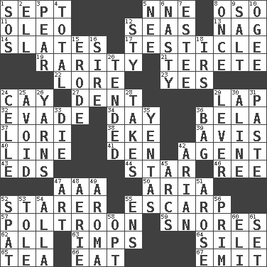 ACROSS 1. Back-to-school mo. 5. Compass dir. 8. Bear (Spanish) 11. Margarine 12. Oceans 13. Tired old horse 14. Chalkboards 17. One of the two male reproductive glands 19. Noteworthy scarcity 21. Cylindrical with tapered ends 22. Old wives' tales, e.g. 23. Affirmative reply 24. Island 27. Undesirable depression on a surface 29. Infant locale 32. Dodge 34. 24 hours 36. Actor Lugosi 37. Australian parrot (variant) 38. Make supply last 39. Deliberation 40. Actor's bit 41. Lair 42. Representative 43. Begley and Asner 44. Play the lead 46. To sift 47. Auto club (abbr.) 50. Roberta Peters solo 52. A viewer who gazes fixedly 55. Fortification 57. Characterized by complete cowardliness 59. Sounds asleep 62. 100% 63. Naughty children 64. Filth; sediment 65. Beverage made from leaves 66. Ingest 67. Give off DOWN 1. Mayday 2. Pipe bend 3. Lightbulb-shaped fruit 4. "_____ Recall" 5. Born 6. Thoroughly unpleasant 7. First name in cosmetics 8. At one time in the past 9. Table seasoning 10. Double curve, resembling the letter S 12. Filthy place 15. Wear away 16. Father 18. Big collection agency 20. Watched over 24. Cell (Danish) 25. Prevent from happening 26. Entertaining tales 28. Receives possession of 29. Crowbar 30. Place in a line 31. Thick mixture 33. Expire 35. Gossips 36. Container for groceries 42. Believer in; advocate of (suffix) 45. Curves 47. Tate display 48. Nest on high 49. Odor 51. Came up 52. Argument over a trivial matter 53. Lacquered or enameled metalware 54. Silent film actress Nazimova 55. Followers of ems 56. Demure 58. Elect 60. Connecticut Ivy Leaguer 61. Arrange properly for use