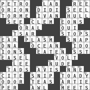 ACROSS 1. Stone: prefix 6. Experiment locale 9. To riddle 12. Constellation of myth 13. "You Light Up My Life" star Conn 14. Sew up the eyelids of hawks and falcons 15. Singer Mel 16. _ the terrible 17. Frame or body of a ship 18. Perceive with the eye 19. Clement's nick name 20. Immeasurably long periods of time 21. Spoken 23. Fr. "Yes" 24. Russian ruler of old 25. Constricts 28. Ewer handle 30. Suffix with ecto or cyto 34. Fastener 35. Heredity factor (abbr.) 36. Sea 38. Wedding promise 39. Charged particles 41. Ingested 43. Fast jet (abbr.) 44. Artist's stand 46. Electrical Unit 48. Area sheltered from the wind 49. Unadorned 50. Small boys 51. Advice 53. Compass dir. 56. Quote 57. Sever or remove by pinching or nipping 58. Sycophant 60. Scent 61. Beverages made from leaves 62. Nick name for Arthur 63. For each 64. Leather borer 65. Confronts DOWN 1. Cooking vessel 2. Greek god of love 3. Become fatigued 4. Lover boys 5. Single 6. Moving, as bait 7. First of billions? 8. Storage container 9. One who advocates reunion 10. Snakelike fish 11. Pipe bend 13. Deli pickle 14. Yells 19. Monte _, Las Vegas Hotel/Casino 20. Greek goddess of the dawn 22. Strike 24. Interpreter 26. Writing tablets 27. Blemish 28. Singer Brickell 29. Small Philippine buffalo 31. Adept person 32. Ocean 33. Floor protector 37. Congenital growth or mark on the skin 40. Sowing specialist 42. Lower and raise head in agreement 45. French article 47. Poe poem 49. Cuts off 50. Event that recurs at intervals 51. Afresh 52. Small bottle 54. Nathan's nickname 55. Prepare for publication 56. Police officer (slang) 57. R.R. building 58. Scottish cap 59. Affirmative reply