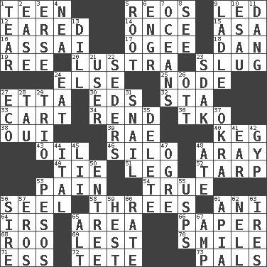ACROSS 1. Adolescent 5. Vintage cars 9. Directed 12. Having ears or earlike features 14. At one time in the past 15. White ___ sheet 16. Slender Brazilian palm 17. Double curve, resembling the letter S 18. One of the 12 tribes of Israel 19. To separate or throw off 20. A period of five years 23. Strike heavily 24. Otherwise 25. Thickened enlargement 27. Singer James 30. Begley and Asner 32. R.R. building 33. Heavy open wagon 34. Tear apart 36. Ring climax 38. Fr. "Yes" 39. Actress Charlotte 40. Barrel 43. Petroleum 46. Grain storage tower 48. Like ___ of sunshine 49. Standoff 51. Part of a journey 52. Canvas cover 53. Ache 54. Loyal 56. Sew up the eyelids of hawks and falcons 58. Trios 61. Cuckoo 64. Big collection agency 65. Length times width 66. Some stationery 68. Friend of Pooh 69. For fear that 70. Grin 71. Double-curved letter 72. False hair 73. Friends DOWN 1. Pull into pieces 2. Relaxation 3. Celtic language 4. Teachers' org. 5. Carrot, for example 6. Engineer (abbr.) 7. Seas 8. Observe 9. Dipping utensil 10. He sold his birthright 11. Mild oath, euphamism for damn 13. Deli pickle 21. One who makes use of a thing 22. Spring feasts 23. Neighbor of Neb. 24. Consume 26. Baseball player Mel 27. Environmental prefix 28. The 19th letter of the Greek alphabet 29. Musical group of three 31. Slow-paced one 35. Erase 37. Gumbo ingredient 41. Hearing organ 42. Hustle 44. Slanted text style (abbr.) 45. Cards in a Roman deck? 47. Legendary monster 48. Had dinner 50. Main course 53. Mexican monetary units 55. United States Postal Service (abbr.) 56. Father 57. Greek god of love 59. Behest 60. Assign a rank or rating to 61. Capital of Western Samoa 62. 1994 drama film starring Jodie Foster 63. Angers 65. Keyboard modifier key 67. Electrical Unit