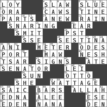 ACROSS 1. Myrna of the movies 4. Cole _ (cabbage dish) 8. Turn sharply 12. Mouth or opening 13. Crow sounds 14. Prong on a fork 15. Pieces 18. Afresh 19. Water falling in drops from the sky 20. Catching in a trap 22. Hearing organ 23. Stricken, poetically 24. Pacific Standard Time (abbr.) 25. Compass dir. 26. French poetic form 30. Black tropical American cuckoo 33. Distance measurement 36. Lyric poems 37. Sweet dark-red dessert wine 39. Opening into something insatiable 40. Tender 41. Russian ruler of old 42. Attaches a signature 44. Had dinner 45. Elected representative 47. Flowery wreath 50. Player for Phoenix 51. Von Bismarck 53. A female animal or person 54. Electrical Measurement 57. Ketch in the Levant 59. Long, evenly shaped pieces 61. Assad's deity 63. Pulitzer Prize-winning author Ferber 64. Toward shelter 65. Compass dir. 66. Paradise 67. Nanny 68. Lair DOWN 1. Trim (branches) 2. Mouths or openings 3. Entertaining tales 4. Glance over 5. Long (Scottish) 6. Deep reverence 7. Compass dir. 8. Ski resort town in Vermont 9. One who doesn't tell the truth 10. University (slang) 11. Car or cant ending 16. Scottish caps 17. Indian titles of respect 21. A distinct part 22. Curvy letter 24. For each 26. Stitched 27. It may be bright or harebrained 28. A home for chicks 29. American tennis player Robert 30. Tenement units (abbr.) 31. Olfactory organ 32. SW Asia republic 34. Arab leader 35. Label 38. File 13 42. Male offspring 43. Groove 46. Third day of the wk. 48. Singer James 49. Slanted text style (abbr.) 52. Stared 53. Trig term 54. Songbird 55. At sea 56. Comfort 57. Perceive with the eye 58. Find the sum of 59. Prohibit 60. In the manner of 62. Layer