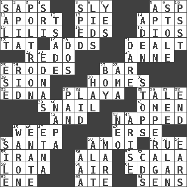 ACROSS 1. Plant excrements 5. Insidious 8. Cleo's killer 11. To the left, to Queeg 13. Sliced dessert 14. Tenement units (abbr.) 15. Ms. Damita and namesakes 16. Begley and Asner 17. "Vaya con ____" 18. Make lace 19. Sums up 21. Started a card game 22. Do over again 24. Queen of England 1702-14 25. Eats (away) 27. Drinking establishment 29. The Jewish people; Israel 30. Residences 32. Pulitzer Prize-winning author Ferber 33. Beach, in Buenos Aires 35. Lie 39. Slow-paced one 41. Sign of something about to happen 42. Also 43. Slept 45. Shed a tear 48. Celtic language 49. Before Barbara or Clara 50. Mine, in Marseilles 52. Sorrow 55. SW Asia republic 56. Wing 57. Any of the three canals of the cochlea 59. Globular water bottle used in Asia 60. Wind 61. _ Allan Poe 62. Compass dir. 63. Had dinner 64. Elected reps. DOWN 1. Table seasoning 2. Capital of Western Samoa 3. Characterized by complete cowardliness 4. _ Lanka 5. Drove too fast 6. Hats (slang) 7. Consenting reply 8. Bee-related 9. Fur scarf 10. Inconspicuous attention getter 12. Sadhe (variant) 14. An important port of Yemen 20. Two (Sp.) 21. Have the gumption 23. Ferber et al. 25. Compass dir. 26. To free from 27. Male child 28. Nanny (var.) 30. Actor Linden 31. Ceases 33. Baking dish 34. Flaplike covering 36. Electrical Measurement 37. Area sheltered from the wind 38. Conclude 40. California wine valley 43. Modern: prefix 44. Originate 45. Make _____ (do battle with) 46. Related on the mother's side 47. Inactive volcano in Sicily 49. Filth; sediment 50. Came down and settled, as after flight 51. Female horse 53. ____ Bator 54. Hearing organs 56. Auto club (abbr.) 58. Music discs