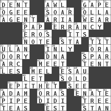 ACROSS 1. Undesirable depression on a surface 5. Leather borer 8. Stare wonderingly 12. Double curve, resembling the letter S 13. Fly high 15. Water jar 16. Representative 18. Roberta Peters solo 19. Put on (as clothing) 20. Infant food 22. Tendancy to err 24. Greek god of love 26. ___ a Wonderful Life 27. Make mention of 28. R.R. building 29. Teat (slang) 32. Uhlan (variant) 35. Inwardly 37. Mouth or opening 38. Dinghy 39. Heredity factor (abbr.) 40. Practice fight 41. Curve 42. Rendezvous 43. Portable shelter 44. French article 45. Cartoonist voice _ Blanc 46. He sold his birthright 49. Allow 50. Disposed of to a purchaser 51. Curse 55. Perceive with the eye 56. First of billions? 57. Mouths or openings 59. Related on the mother's side 63. Corncob 64. "You Light Up My Life" star Conn 65. Woody plant 66. Beverages made from leaves 67. Eastern Standard Time (abbr.) 68. Comedian Laurel of Laurel & Hardy DOWN 1. ___ good deed 2. Ovum 3. Born 4. 3-inch nail 5. White ___ sheet 6. Had on 7. Den 8. Brides' dresses 9. Actor Baldwin 10. Shaw product 11. Ewer handle 14. Noteworthy scarcity 17. Pacific island yam 21. Plant holder 23. _ moment's notice (2 wds.) 25. Beer mug 28. Chalkboards 29. Drink excessively 30. SW Asia republic 31. Small pie 32. Hereditary estate 33. Old wives' tales, e.g. 34. Curves 36. Compass dir. 40. SAT takers 42. Mode 45. Was introduced to 47. Mayday 48. Toward shelter 49. Citrus fruits 51. Singer Brickell 52. Dad 53. 4th largest of the Great Lakes 54. Small boys 56. Fitting 58. Be seated 60. Tate display 61. Afternoon social gathering 62. Car or cant ending