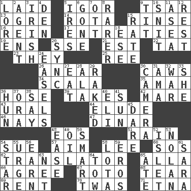 ACROSS 1. Put down 5. Composer Stravinsky 9. Russian ruler of old 13. Legendary monster 14. Roll call or roster of names 15. Wash lightly 16. It's straight from the horse's mouth 17. Pleas 19. Followers of ems 20. Compass dir. 21. Eastern Standard Time (abbr.) 22. Make lace 23. Those things 25. Portuguese money of account (variant) 26. Approach 30. Crow sounds 34. Any of the three canals of the cochlea 35. Nanny 36. Flexible conduit 39. Proceeds 42. Female horse 43. Mountain range 44. Evade 46. Negative votes 47. Middle Eastern gold or silver currency 48. Greek goddess of the dawn 51. Precipitation 54. Institute legal proceedings 57. Direct toward a target or goal 58. Area sheltered from the wind 60. Mayday 62. Interpreter 65. Silent film actress Nazimova 66. Match 67. Printing process, for short 68. Pull apart 69. Monthly bill 70. It was, poetically 71. Inactive volcano in Sicily DOWN 1. Old wives' tales, e.g. 2. Rep 3. From or relating to Ireland 4. Lair 5. Angers 6. Went 7. Baseball player Mel 8. Less widely known 9. Teat (slang) 10. In a ____ (agitated or irritated) 11. Toward the sea 12. Take ten 15. Pace 18. Compass dir. 20. Synchronize (abbr.) 24. Artist's stands 27. Ingest 28. Insect wing 29. Swept the length of 30. Device for capturing images 31. Housemaid (var.) 32. Armed conflict 33. A female animal or person 36. Attila the _ 37. Mouth or opening 38. Declare 40. Connecticut Ivy Leaguer 41. Player for Phoenix 45. Have the gumption 48. Comfort 49. Petroleum 50. Don Adams' spy role 52. Small island 53. Pitcher Ryan 54. Play the lead 55. Goad 56. Merit 58. Globular water bottle used in Asia 59. Greek god of love 61. "Two Mules for Sister ____" 63. Fish or hair follower 64. Pull behind 65. Had dinner
