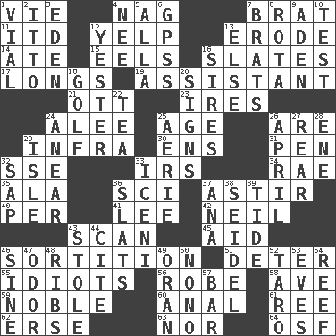 ACROSS 1. Compete 4. Tired old horse 7. Naughty child 11. It would 12. Sharp bark 13. Eat (away) 14. Had dinner 15. Snakelike fish 16. Chalkboards 17. Yearns 19. Helper 21. Baseball player Mel 23. Angers 24. Toward shelter 25. Personal question 26. "We ___ not amused" (Victoria) 29. Kind of red light 30. Followers of ems 31. Writing instrument 32. Compass dir. 33. Big collection agency 34. Actress Charlotte 35. In the manner of 36. _-fi 37. Having gotten out of bed 40. For each 41. Area sheltered from the wind 42. Famous astronaut Armstrong 43. Glance over 45. Assist 46. Conclusion 51. Prevent from occurring 55. Foolish or stupid persons 56. Loose flowing garment 58. "___ Maria" 59. Impressive in appearance 60. Of or related to the anus 61. Portuguese money of account (variant) 62. Celtic language 63. And not 64. Order of Saint Francis (abbr.) DOWN 1. Small bottle 2. "Tell ____ the Marines!" 3. Locale of original sin 4. Born 5. Silent film actress Nazimova 6. Global Positioning Systems (abbr.) 7. Naughty children 8. Round or rotation of duties 9. An important port of Yemen 10. Trial 12. Of or pertaining to yesterday 13. Otherwise 16. Founders of families 18. Eighteen holes 20. Omens 22. Afternoon social gathering 24. Approach 25. Nest on high 26. Showery time 27. Bring up, as a child 28. Compass dir. 29. Small island 32. Plant excrement 33. Ancient Celtic tribe of eastern Britain 36. Narrow boards 37. Santa ___, CA 38. A glass for beer 39. Event that recurs at intervals 43. Took without asking 44. Quote 46. Trig term 47. Scent 48. Teases 49. Northwest Algerian city 50. Words to Nanette 52. Edible starchy tuberous root 53. Nights before holidays 54. Coral ridge 57. Tavern