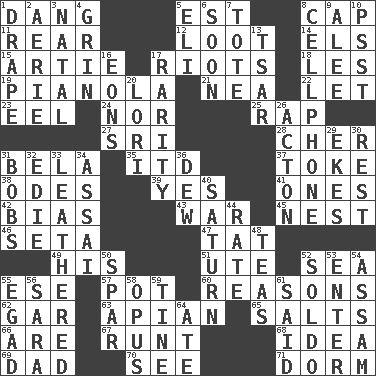 ACROSS 1. Mild oath, euphamism for damn 5. Eastern Standard Time (abbr.) 8. Head covering 11. Bring up, as a child 12. Plunder 14. Raised railways 15. Nick name for Arthur 17. Disturbances 18. French article 19. Player piano 21. Teachers' org. 22. Allow 23. Snakelike fish 24. And not 25. Reproach for some lapse or misdeed 27. Indian title of respect (Mr.) 28. "Mermaids" star 31. Actor Lugosi 35. It would 37. Casino tip 38. Lyric poems 39. Consenting reply 41. Singles 42. Prejudice 43. Armed conflict 45. A home for chicks 46. Bristle 47. Make lace 49. Part of HMS, perhaps 51. Shoshoni 52. Ocean 55. Compass dir. 57. Cooking vessel 60. Thinks logically 62. Slender fish 63. Bee-related 65. Table seasonings 66. "We ___ not amused" (Victoria) 67. The smallest animal of a litter 68. The main thing one is thinking about 69. June honoree 70. Perceive with the eye 71. Dormintory (informal) DOWN 1. Window treatment 2. Nest on high 3. Relating to or accompanying birth 4. Broad smile 5. Connecticut Ivy Leaguer 6. Within a short period 7. Lug 8. Portable communications device 9. Toward shelter 10. Inconspicuous attention getter 13. Russian ruler of old 16. Immeasurably long periods of time 17. Noteworthy scarcity 20. Australian parrot (variant) 26. NE Massachussets city 29. Supplements with great effort 30. Remainder 31. Moves up and down 32. Singer Brickell 33. Resembling or made to resemble leather 34. Slender Brazilian palm 36. Morning condensation 40. Titan orbits this 44. Pace 48. Beverages made from leaves 50. Practice fight 52. Twentieth part of a lira 53. Keyboard key 54. Indian state 55. Mild oath 56. "Two Mules for Sister ____" 58. Musical composition 59. Prong on a fork 61. Expressed in words 64. Had dinner