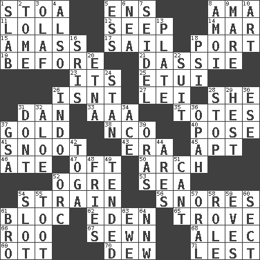ACROSS 1. Portico 5. Followers of ems 8. Wet nurse (var.) 11. Hang loosely or laxly 12. Ooze 14. Make imperfect 15. Collect or gather 17. Move on water 18. Left side of a ship or aircraft 19. Prior to 21. Hyrax 23. It is 25. Needle holder 26. Is not 27. Luau accessory 28. A female animal or person 31. One of the 12 tribes of Israel 33. Auto club (abbr.) 35. Hauls 37. Precious metal 38. Non-commissioned officer (abbr.) 40. Introduce or present, as a question 41. Snout, nose 43. Period 45. Fitting 46. Had dinner 47. Often (poetically) 50. Bowlike part 52. Legendary monster 53. Ocean 54. Put through a sieve 56. Sounds asleep 61. Group of countries in special alliance 62. Genesis locale 65. Collection of objects 66. Friend of Pooh 67. Stitched 68. Actor Baldwin 69. Baseball player Mel 70. Morning condensation 71. For fear that DOWN 1. Broad, flat, thick piece 2. Heavy book 3. Norwegian king 4. In addition 5. Curvy letter 6. Teachers' org. 7. Beer mug 8. Mine, in Marseilles 9. Female horse 10. Nonscientific branch of learning 13. Food holder 16. Indian titles of respect 18. 23rd letter of the Greek alphabet 20. Inactive volcano in Sicily 22. Set or collection 24. Comedian Laurel of Laurel & Hardy 26. _ china 28. Constrict 29. Command 30. Compass dir. 31. Do not 32. _ vera 34. Adept person 36. Brightly colored fish 37. Girls' org. (abbr.) 39. Mouths or openings 42. Ancient Roman robe 44. Ancient Greek god of war 48. Strips of potato fried in deep fat 49. Looked after 51. Patter 52. The grampus (Milton) 54. Narrow, elongated depression 55. A blast of a horn 57. Of the mouth 58. Hero or heavy, e.g. 59. Nights before holidays 60. Religious group 61. Sis' sibling 63. She-sheep 64. Compass dir.