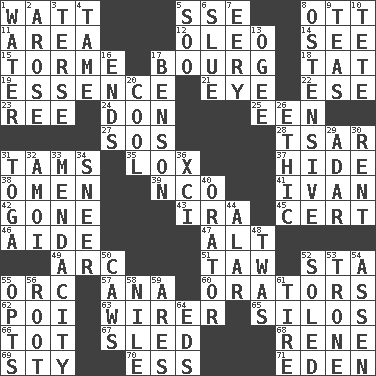ACROSS 1. Electrical Unit 5. Compass dir. 8. Baseball player Mel 11. Length times width 12. Butter sub 14. Observe 15. Singer Mel 17. Town 18. Make lace 19. Center 21. Sight organ 22. Compass dir. 23. To separate or throw off 24. Spanish title 25. Car or cant ending 27. Mayday 28. Russian ruler of old 31. Scottish caps 35. Brine-cured salmon 37. Flintstone garb 38. Sign of something about to happen 39. Non-commissioned officer (abbr.) 41. "Terrible" tsar 42. Went 43. Lyricist Gershwin 45. Sure thing 46. Assistant 47. The first octave above the treble staff 49. Curve 51. The 23rd letter of the Hebrew alphabet 52. R.R. building 55. The grampus (Milton) 57. Santa ___, CA 60. Speakers 62. Luau course 63. One who wires 65. Grain storage towers 66. Small child 67. Downhill vehicle 68. French philosopher Descartes 69. Filthy place 70. Double-curved letter 71. Genesis locale DOWN 1. Wetness 2. Came up 3. Laconic 4. Docile 5. "Barney Miller" actor Jack 6. Change direction abruptly 7. Suggestive of the supernatural 8. Clearly or manifestly demonstrative 9. Afternoon social gatherings 10. False hair 13. Double curve, resembling the letter S 16. Conclusions 17. Gillaume's butler role 20. Calm and collected 26. Value system 29. The sixth month of the Jewish calendar 30. Monthly bill 31. Ancient Roman robe 32. Mine, in Marseilles 33. Ananias' fault 34. Contemptuous expression 36. One more than ninety 40. Speaker 44. Having or resembling wings 48. It was, poetically 50. Crow sounds 52. Having a sole or soles 53. Marketplace scale 54. NE Netherlands city 55. Chooses 56. Carrot, for example 58. "Death on the ____" 59. Ancient Greek god of war 61. Hoop that covers a wheel 64. Begley and Asner