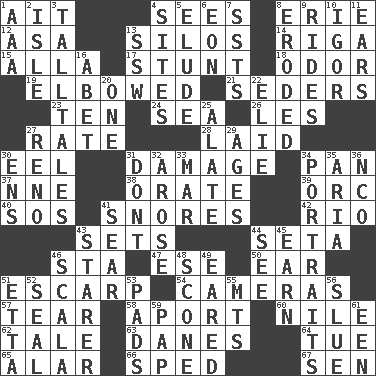 ACROSS 1. Small island 4. Observes 8. One of the Great Lakes 12. White ___ sheet 13. Grain storage towers 14. Port city in Latvia 15. Silent film actress Nazimova 17. Difficult or unusual or dangerous feat 18. Aroma 19. Turned at an angle; bent 21. Spring feasts 23. "___ Little Indians" 24. Ocean 26. French article 27. Assign a rank or rating to 28. Put down 30. Snakelike fish 31. Break 34. Baking dish 37. Compass dir. 38. Declaim 39. The grampus (Milton) 40. Distress signal 41. Sounds asleep 42. River (Sp.) 43. Puts into a specified state 44. Bristle 46. R.R. building 47. Compass dir. 50. Hearing organ 51. Fortification 54. Devices for capturing images 57. Separate forcefully 58. To the left, to Queeg 60. The longest river in the world 62. Falsehood 63. Natives or inhabitants of Denmark 64. Third day of the wk. 65. Having or resembling wings 66. Drove too fast 67. Elected rep. DOWN 1. Auto club (abbr.) 2. Capri or Wight 3. Baron Munchausen's specialties 4. Settings 5. Evade 6. Period of immesurable duration 7. Fast planes 8. Worn away 9. Amusement-park features 10. Composer Stravinsky 11. Hearing organs 13. Compass dir. 16. Collude with 20. Single 22. Writer Wiesel 25. Having winglike extensions 27. Former U.S. Attorney General Janet 29. Eras 30. Followers of ems 31. Do not 32. Came up 33. Make imperfect 34. Likenesses of persons 35. Roberta Peters solo 36. Non-commissioned officer (abbr.) 41. Wither 43. A viewer who gazes fixedly 44. Observe 45. Merit 46. Any of the three canals of the cochlea 48. Biscuitlike quick bread 49. Having ears or earlike features 51. Singer James 52. Lick closed 53. Groovy apts. 55. Mountains (abbr.) 56. Change direction abruptly 59. Infant food 61. Car or cant ending