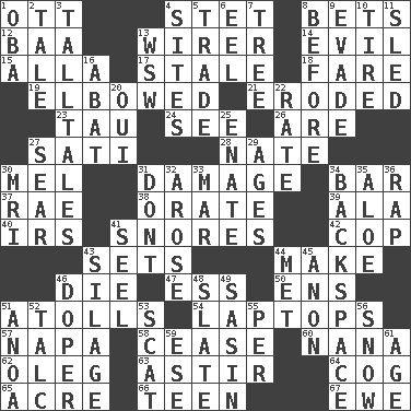 ACROSS 1. Baseball player Mel 4. Proofreading order 8. Stakes 12. Sound made by sheep 13. One who wires 14. Morally bad or wrong 15. Silent film actress Nazimova 17. Showing deterioration from age 18. Conductor's collection 19. Turned at an angle; bent 21. Worn away 23. The 19th letter of the Greek alphabet 24. Observe 26. "We ___ not amused" (Victoria) 27. Suttee (variant) 28. Nathan's nickname 30. Cartoonist voice _ Blanc 31. Break 34. Soap unit 37. Actress Charlotte 38. Declaim 39. Insect wing 40. Big collection agency 41. Sounds asleep 42. Police officer (slang) 43. Arranges properly for use 44. Create 46. Expire 47. Double-curved letter 50. Followers of ems 51. Ringlike coral islands and reefs 54. Portable computers 57. California wine valley 58. Stop 60. Grandmother 62. Cassini of fashion 63. Having gotten out of bed 64. Gear tooth 65. 1/640 square mile 66. Adolescent 67. She-sheep DOWN 1. Chief or king in Benin or Nigeria 2. Story 3. Baron Munchausen's specialties 4. Locates 5. Barter 6. Snakelike fish 7. Family _ (genealogy) 8. Prior to 9. Dodge 10. Hoop that covers a wheel 11. Downhill vehicle 13. Compass dir. 16. Blind as ____ 20. Fr. "Yes" 22. Assign a rank or rating to 25. Maternal 27. Scorch 29. Grows older 30. Medical imaging device (abbr.) 31. Do not 32. Came up 33. Third mo. 34. Keyboard key 35. Medicinal plant 36. Hit sharply and swiftly 41. Stitch closed the eyes of (a falcon) 43. Fodder prepared in a silo 44. Was introduced to 45. Soon (poet.) 46. Drug addict 48. Schedule 49. Indian antelope 51. Small Philippine buffalo 52. Baby powder 53. Scram, to a cat 55. For each 56. Overwhelm 59. Compass dir. 61. Ripen