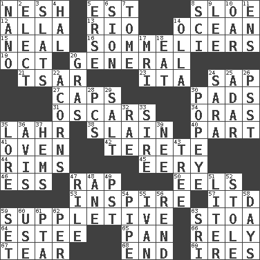 ACROSS 1. Tender 5. Eastern Standard Time (abbr.) 8. _ gin 12. Silent film actress Nazimova 13. River (Sp.) 14. Sea 15. Be tempered by heat 16. Wine waiters 19. Sep. follower 20. Commissioned military rank 21. Russian ruler of old 23. Call ___ day 24. Plant excrement 27. Smile enhancers 30. Writing tablets 31. Motion picture awards 34. Mouths or openings 35. Cowardly lion portrayer 38. Killed 40. Piece 41. Baking chamber 42. Cylindrical with tapered ends 44. Basketball hoops 45. Suggestive of the supernatural 46. Curvy letter 47. Reproach for some lapse or misdeed 50. Snakelike fish 53. Stimulate to action 57. It would 59. Supplementary 63. Portico 64. First name in cosmetics 65. Baking dish 66. Depend 67. Lacerate 68. Conclude 69. Angers DOWN 1. Billionth: prefix 2. Opt 3. Narrow boards 4. Actor Linden 5. Celtic language 6. The Jewish people; Israel 7. Heavy book 8. _-fi 9. Area sheltered from the wind 10. Boat paddle 11. Followers of ems 14. Rounded earthenware pot or jar 17. Medical imaging device (abbr.) 18. Ingest 20. Pate de foie ____ 22. Oak nuts 24. "Two Mules for Sister ____" 25. The sixth month of the Jewish calendar 26. Inconspicuous attention getter 28. Personal Computers (abbr.) 29. Table seasoning 30. Wimpy's pal 32. Actress Charlotte 33. The founder of a family 35. Old wives' tales, e.g. 36. Opinion 37. Folds over and sews together 39. Born 43. Woody plant 47. Cause heat under the collar 48. One (Scot) 49. Pacific Standard Time (abbr.) 51. 61 cubic inches 52. Took without asking 54. Corncob 55. "Terrible" tsar 56. Tear apart 58. 24-hour periods 59. Arrange properly for use 60. Purpose 61. Parent Teacher Assoc. 62. For each 63. Indian title of respect (Mr.)