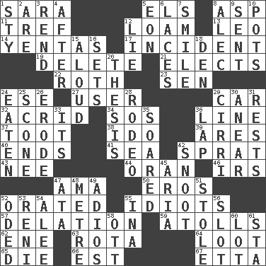 ACROSS 1. "Two Mules for Sister ____" 5. Raised railways 8. Cleo's killer 11. Not kosher 12. Rich soil 13. Lion 14. Gossips 17. Happening 19. Erase 21. Chooses 22. Writer of Portnoy's Complaint (1969) 23. Elected rep. 24. Compass dir. 27. One who makes use of a thing 29. Automobile 32. Bitter 34. Distress signal 36. Actor's bit 37. A blast of a horn 38. Wedding promise 39. Ancient Greek god of war 40. Extremities 41. Ocean 42. Small fatty European fish 43. Born 44. NW Algerian seaport 46. Big collection agency 47. Nursemaid (var.) 50. Greek god of love 52. Spoke pompously 55. Foolish or stupid persons 57. Conveyance 59. Ringlike coral islands and reefs 62. Compass dir. 63. Roll call or roster of names 64. Spoils 65. Pass on 66. Eastern Standard Time (abbr.) 67. Singer James DOWN 1. Filthy place 2. "We ___ not amused" (Victoria) 3. Tear apart 4. Following 5. Period of immesurable duration 6. Shoestrings 7. Grin 8. Actor Baldwin 9. Posted 10. Cooking vessels 12. Untruth 15. Verbally 16. Puts into a specified state 18. Lair 20. College paper 24. Ingested 25. Biscuitlike quick bread 26. Wear away 28. Cowboy competition 29. High-altitude cloud 30. Approach 31. Musical pauses 33. It is 35. Flew 36. Infant locale 42. Snout, nose 45. Operatic vocal solo 47. "One Day ___ Time" 48. Distance measurement (Brit.) 49. Goodbye (Sp.) 51. Took without asking 52. Wrote a lyric poem 53. Painter Guido (1575-1642) 54. Toward shelter 55. _ tizzy (2 wds.) 56. Position in a hierarchy or organization 58. Baseball player Mel 60. Car dealer's back yard 61. R.R. building