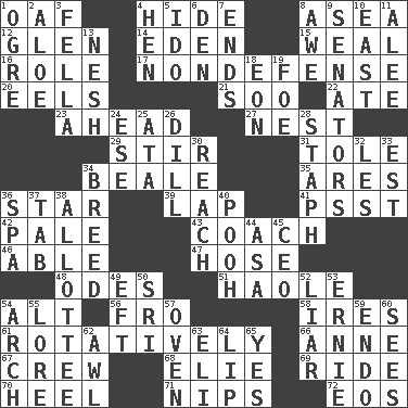 ACROSS 1. Clumsy lout 4. Flintstone garb 8. Toward the sea 12. Small, secluded valley 14. Genesis locale 15. Welt 16. Hero or heavy, e.g. 17. Unrelated to defense, as in spending 20. Snakelike fish 21. "Barney Miller" actor Jack 22. Had dinner 23. Toward the future 27. Egg locale 29. Tumult 31. Lacquered or enameled metalware 34. Memphis, Tenn. Street 35. Ancient Greek god of war 36. Play the lead 39. Infant locale 41. Inconspicuous attention getter 42. Light colored 43. Team commander 46. Competent 47. Flexible conduit 48. Lyric poems 51. White Person, in Hawaii 54. Keyboard modifier key 56. Away 58. Angers 61. Rotating or pertaining to rotation 66. Queen of England 1702-14 67. Ship's personnel 68. Writer Wiesel 69. Travel on an animal 70. The bottom of a shoe or boot 71. Cuts off 72. Greek goddess of the dawn DOWN 1. Legendary monster 2. _ vera 3. Chap (slang) 4. Layer 5. Wedding promise 6. Lair 7. Conclusions 8. Deep reverence 9. Legislators 10. Compass direction 11. Toward shelter 13. Tender 18. A really long time 19. Enemy 24. Compass dir. 25. _ moment's notice (2 wds.) 26. Deli pickle 28. Staphylococcus 30. Arrive at 32. French article 33. Eastern Standard Time (abbr.) 34. A special lineage 36. Health resort 37. Bar bill 38. One to whom something is allotted 40. "Silly old bear" 44. White ___ sheet 45. Corporate head (abbr.) 49. Lizard (obsolete) 50. _ Lanka 52. One who doesn't tell the truth 53. Bert's buddy 54. Bowlike part 55. Old wives' tales, e.g. 57. Baking chamber 59. Inside; within (prefix) 60. Perceives with the eye 62. Leather borer 63. Biblical high priest 64. Mouth edge 65. It is so