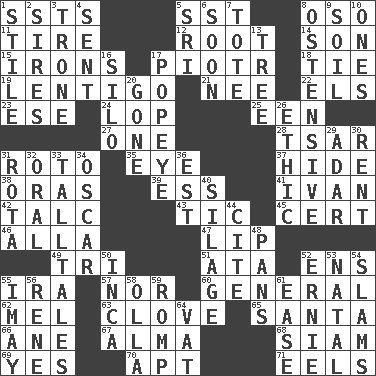 ACROSS 1. Fast planes 5. Fast jet (abbr.) 8. Bear (Spanish) 11. Hoop that covers a wheel 12. Carrot, for example 14. Boy, to dad 15. Metal shackles 17. Peter (Polish) 18. Make a knot 19. Small, flat, pigmented spot on the skin 21. Born 22. Raised railways 23. Compass dir. 24. Chop off 25. Car or cant ending 27. Single 28. Russian ruler of old 31. Printing process, for short 35. Sight organ 37. Flintstone garb 38. Mouths or openings 39. Double-curved letter 41. _ the terrible 42. Baby powder 43. Nervous spasm 45. Sure thing 46. Silent film actress Nazimova 47. Mouth edge 49. Three (prefix) 51. "One Day ___ Time" 52. Followers of ems 55. Lyricist Gershwin 57. And not 60. Commissioned military rank 62. Cartoonist voice _ Blanc 63. Garlic unit 65. Before Barbara or Clara 66. A saturated hydrocarbon 67. _ mater 68. Thailand, formerly 69. Consenting reply 70. Fitting 71. Snakelike fish DOWN 1. Vertical member of a panel or frame 2. Fathers 3. Marketplace scale 4. Posted 5. Indian title of respect (Mr.) 6. Within a short period 7. Carry 8. Clearly or manifestly demonstrative 9. Land 10. Singles 13. Woody plant 16. Grain storage tower 17. Wimpy's pal 20. Went 26. Value system 29. The sixth month of the Jewish calendar 30. Monthly bill 31. Roll call or roster of names 32. Relating to the mouth 33. Baron Munchausen's specialties 34. Witty Wilde 36. Eastern Standard Time (abbr.) 40. Fodder prepared in a silo 44. Quote 48. Baking dishes 50. South American Indian 52. Bert's buddy 53. Brizilian seaport 54. Shuts with force 55. "If ____ say so..." 56. French philosopher Descartes 58. Spanish pot 59. Play 61. Comfort 64. Large container